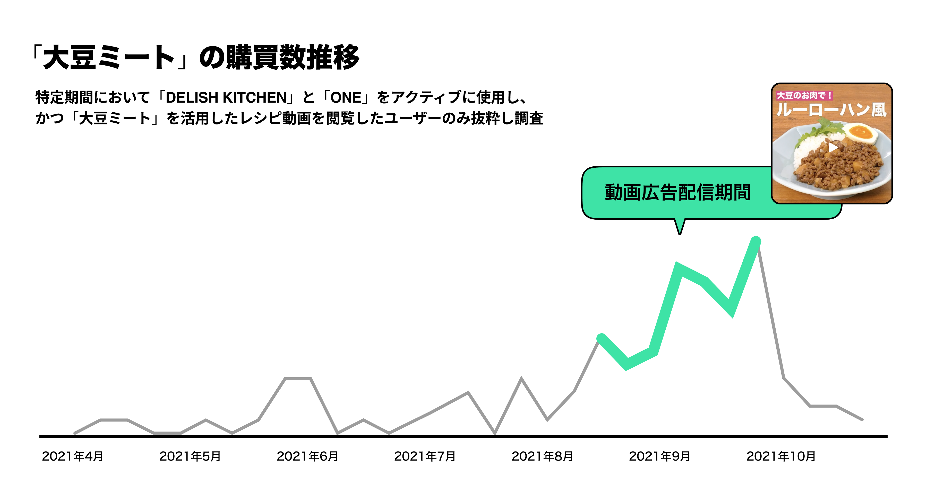 マルコメ(株)の商品「大豆ミート」を扱った広告施策では、継続的な購買数の推移を検証しました。『DELISH KITCHEN』 にて制作したタイアップ動画広告「ルーローハン風」のレシピ動画を、2021年8月17日から10月1日の期間に『DELISH KITCHEN』 アプリ内でターゲティング配信を実施したところ、同期間に購買数が上昇しました。