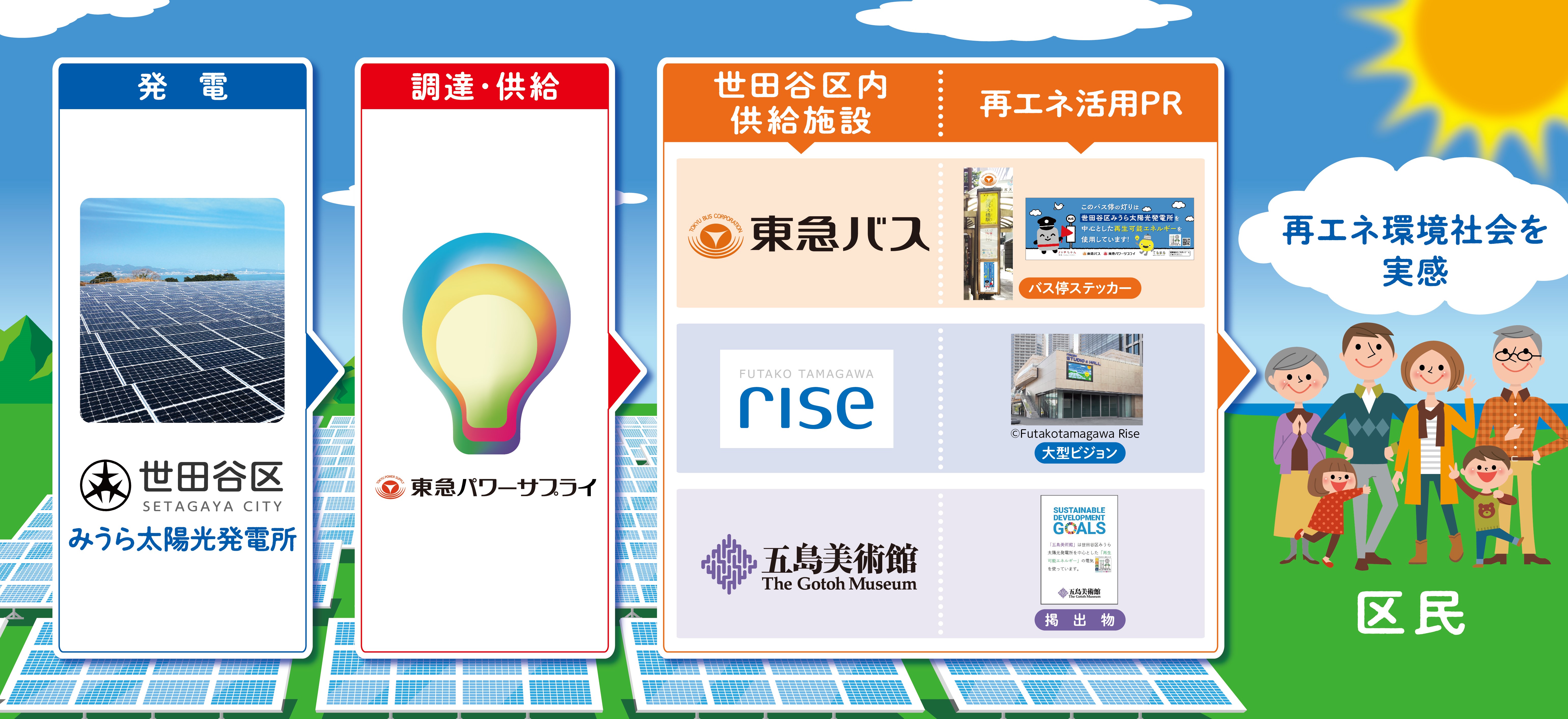 東急パワーサプライは、東急世田谷線の再生可能エネルギー100%による運行支援をはじめ、先進的で環境に優しいスマートな街づくりを進めております。本取組みでは「みうら太陽光発電所」由来の電力と非化石証書の組合せで、「世田谷区内の重要な交通インフラである東急バスの停留所(一部)」、「世田谷区内で有数の複合施設である二子玉川ライズ」、「世田谷区における文化芸術の発信拠点である五島美術館」に、実質再生可能エネルギー100%の電力を供給します。
