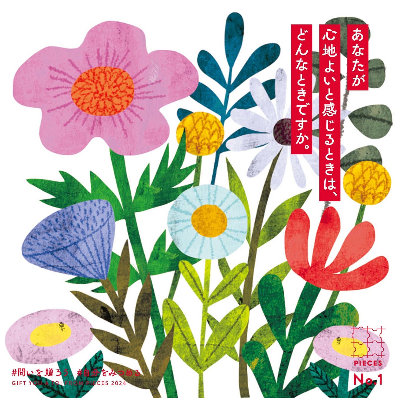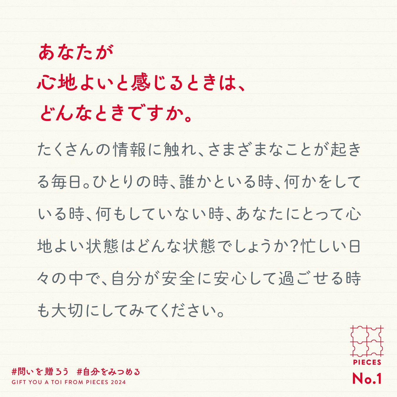 期間中、PIECESの公式Xから「問い」を贈ります(Instagram、Facebookでも発信します)。問いを受け取りお返事をしたり、誰かのお返事にいいねをしたり、みなさんのアクションでキャンペーンを広げてください。