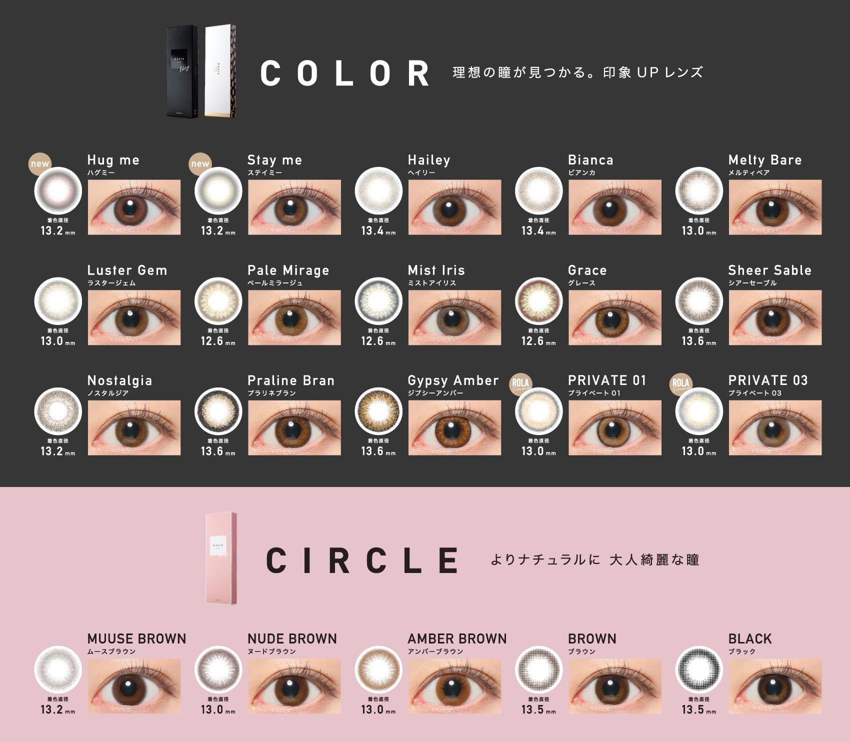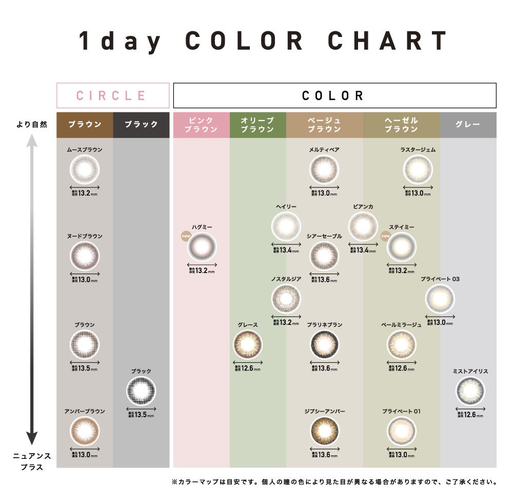 幅広い年代の方に愛用頂ける事をコンセプトに掲げ誕生したレンズブランド。レンズ直径 14.1mm を採用し、自然な美しい瞳になれるようにデザインやイメージごとに着色直径を変えた レンズラインナップ。