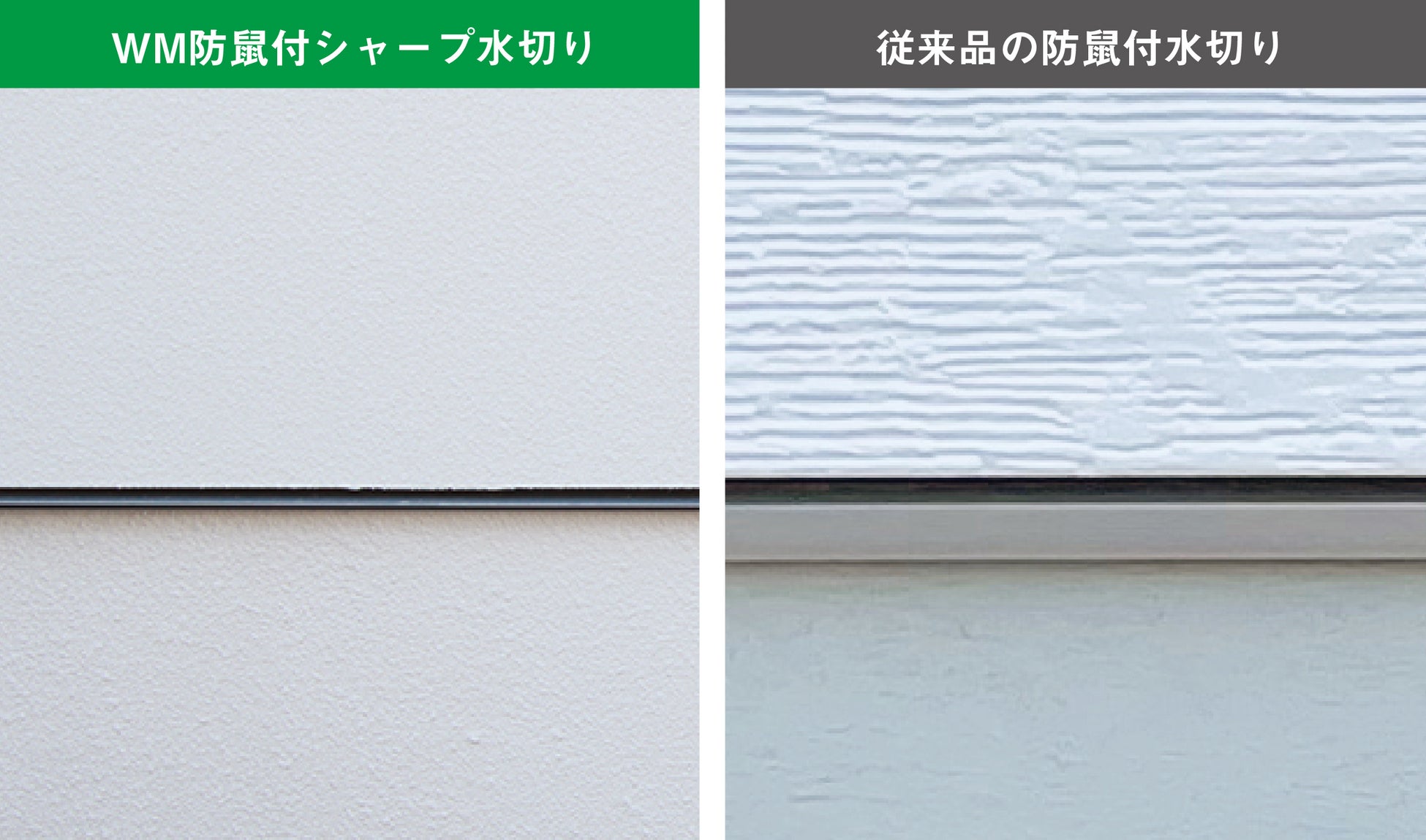 「WM防鼠付きシャープ水切り」は、当社の外壁工事部材のブランドである「GAISO」の「WM(調和)シリーズ」としてラインナップされた製品で、水切りの面を無くすという全く新しいデザインによりノイズレスな外観を実現するとともに、水切りとしての機能・性能をしっかり有しており、長持ち住まいをささえます。