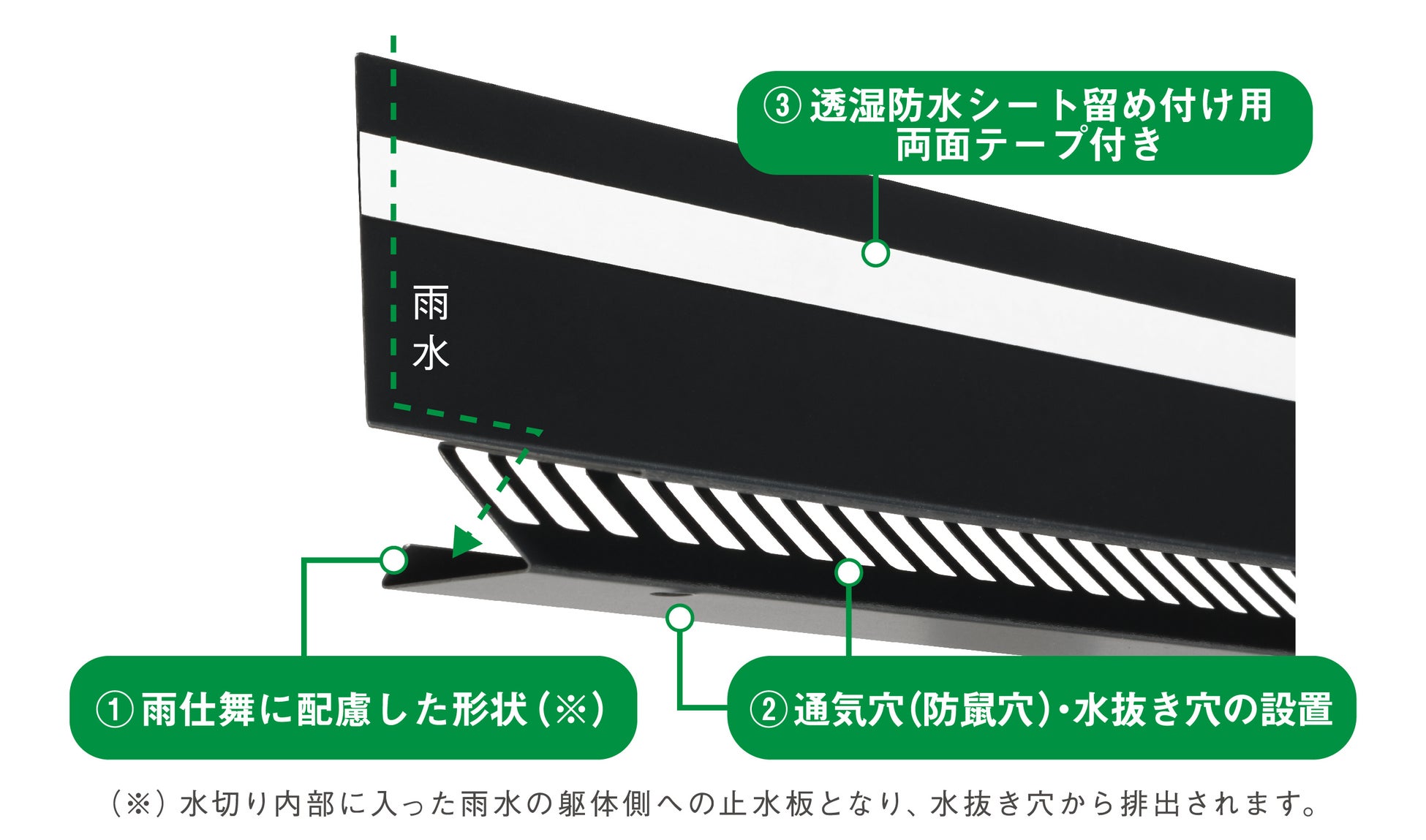 ・平均風速15ⅿ/sにおいて有害な漏水がない防水性能を確保。透湿防水シート留付け用の両面テープも付帯