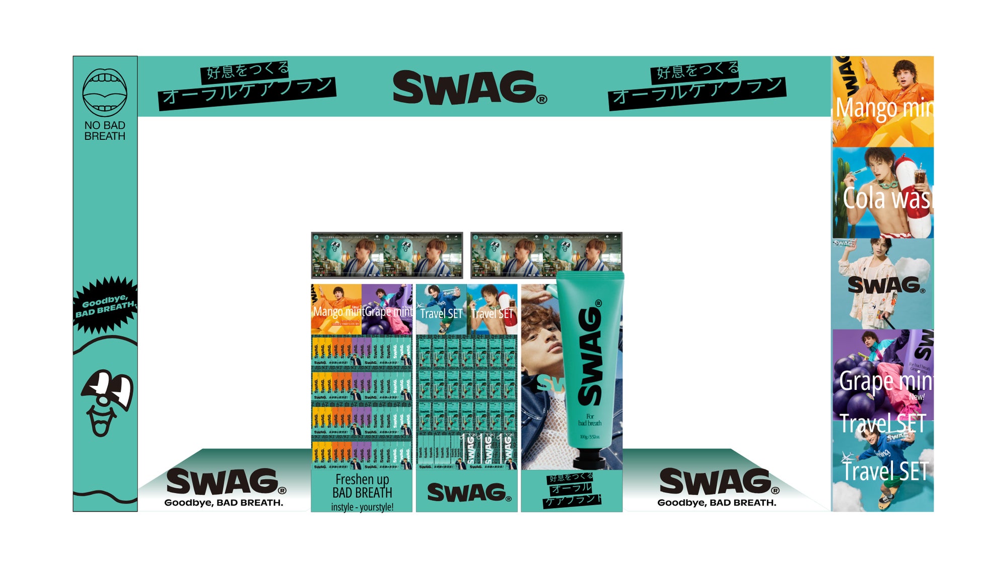今回のPOP UPでは、「Grape mint」「Cola wash」「Travel SET」など、SWAGの人気アイテムをラインアップ。それぞれのフレーバーやテーマに合わせた白濱亜嵐さんのポップで爽快なビジュアルが並び、SWAGの世界観を体感できる空間となっています。