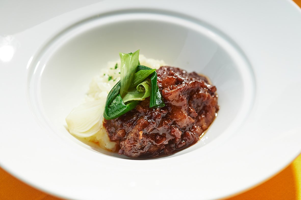 さらにメインディッシュとしてご提供する“オリーブ牛のブレゼ パルメザンチーズのリゾット添え”は肉質の良さが特徴の香川県産「オリーブ牛」を柔らかく煮込んだ一品です。オリーブ牛の旨みと濃厚なマデラ酒、タマネギの甘味、トマトの酸味のバランスが良く、チーズリゾットとの相性も絶妙で、最後のひと口までお楽しみいただけます。