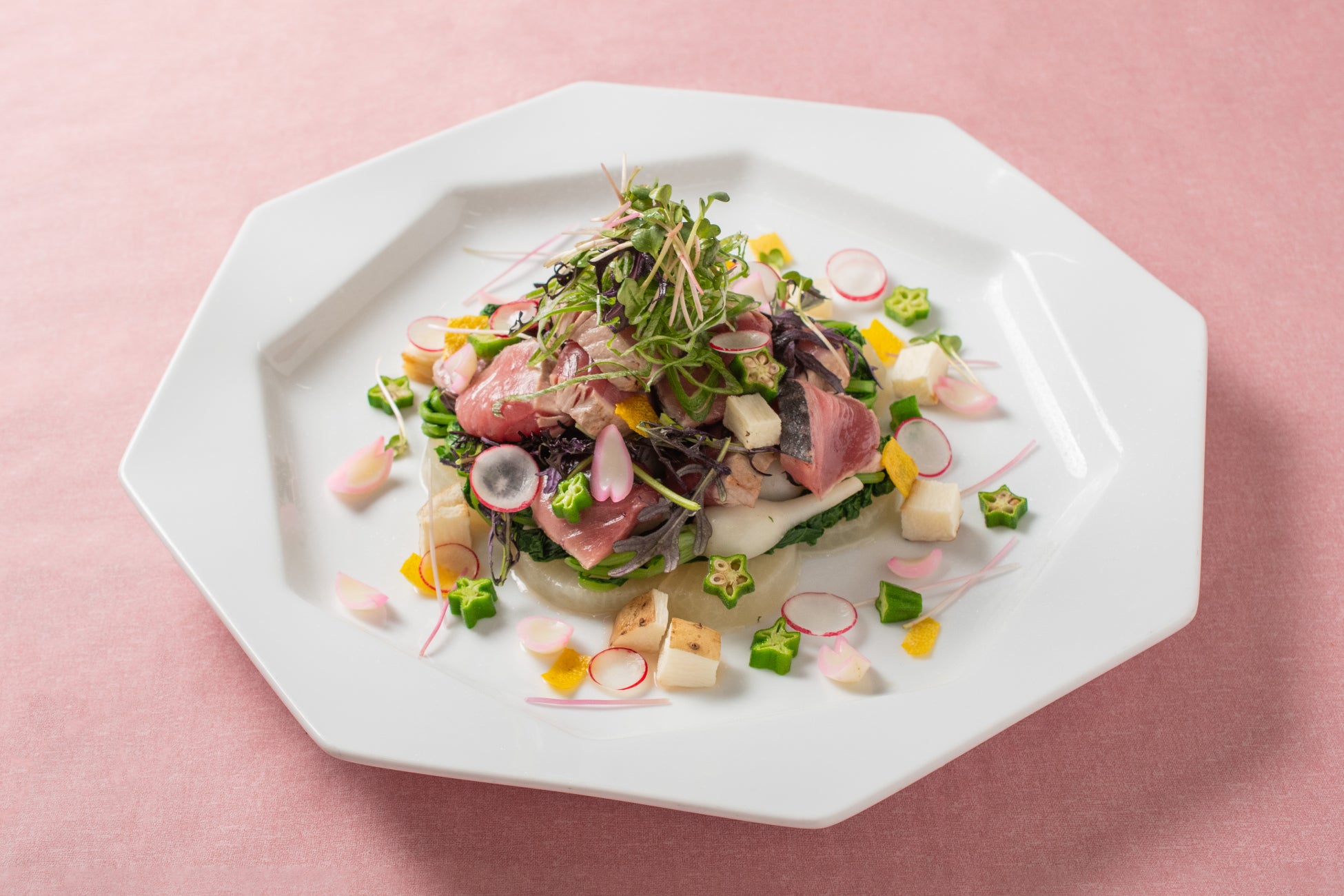 鮮やかな春野菜と旬魚に、特製の中華風ピリ辛ソースをかけてお召し上がりいただく、エキゾチックな一品です。
