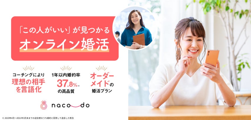 「naco-do」は、業界最大121,000人の会員数(*2)をもとにした出会いの提供だけでなく、独自のコーチングプログラムを修了した専属サポーターが出会いから結婚まで伴奏する婚活コーチングサービスを提供しています。