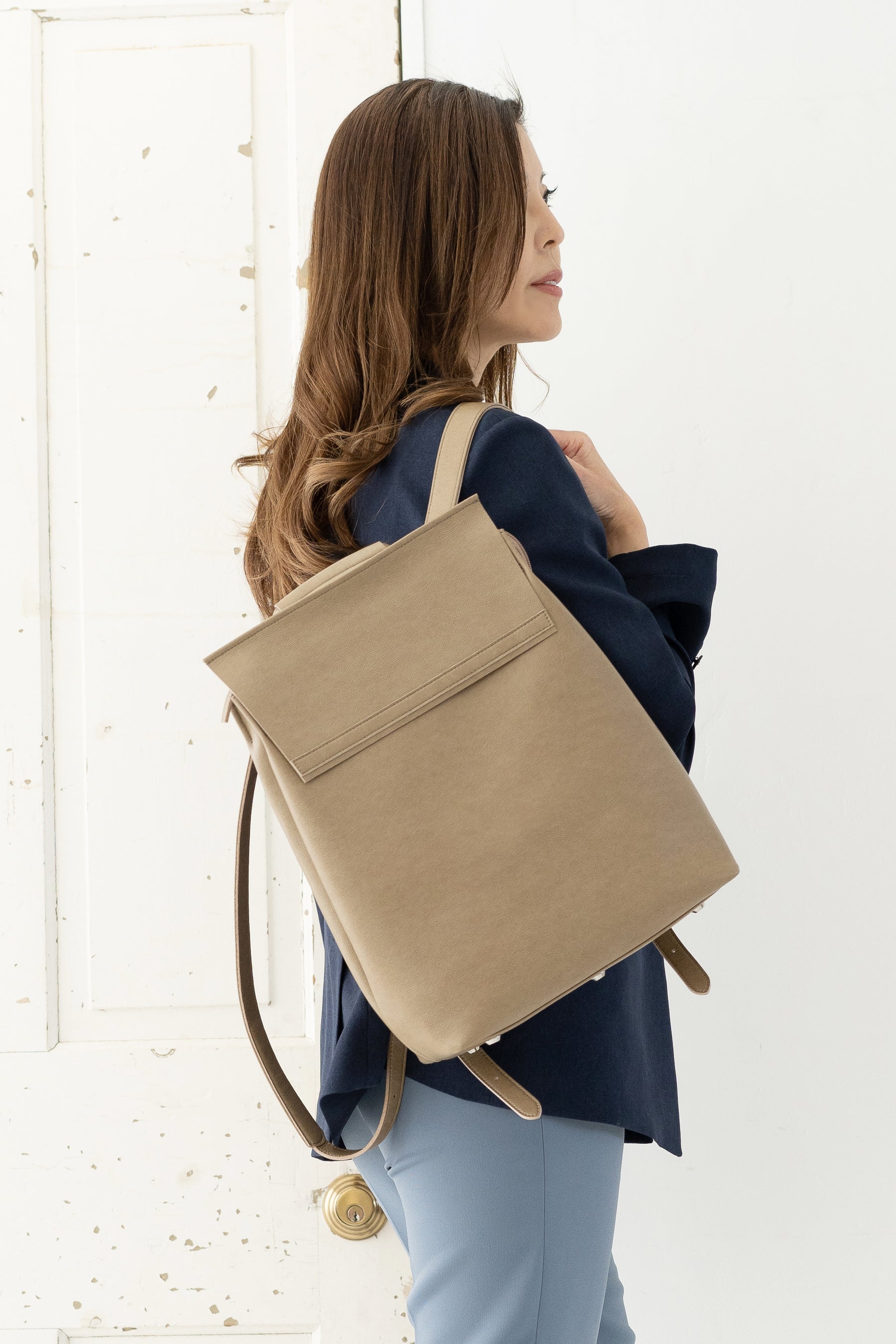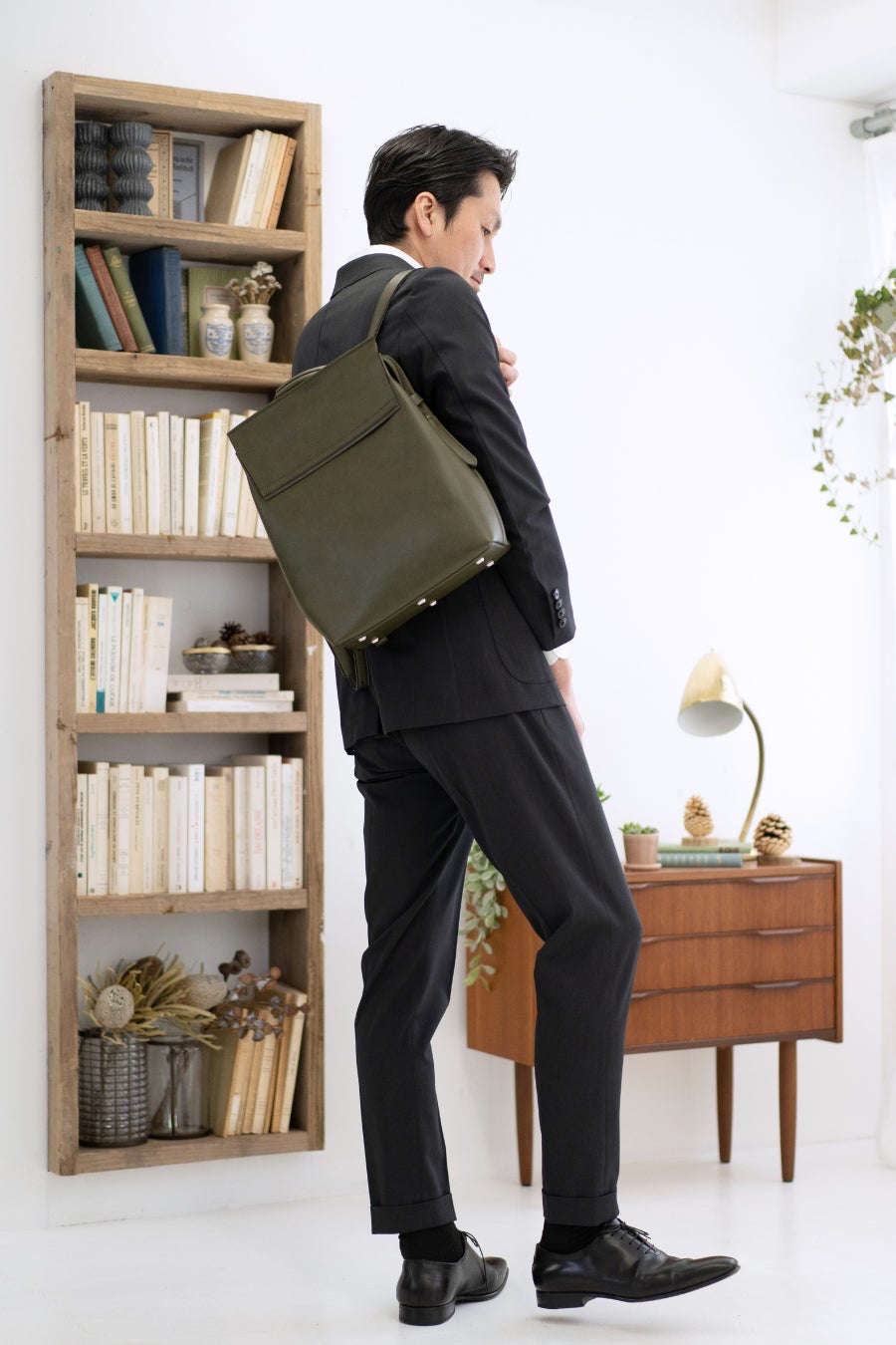 ジャケットとも相性がよいデザインで、ノートパソコンや資料がしっかり収納できるお仕事用のビジネスリュックを、軽量で耐久性の高い日本製のヴィーガンレザーを使用して製作いたしました。