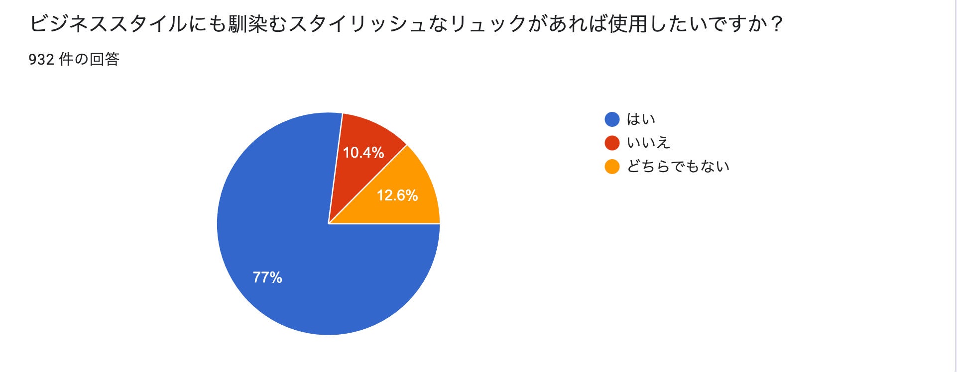 「ビジネススタイルにもなじむスタイリッシュなリュックがあれば使用したいか」という具体的な質問に、77%の方が「はい」と回答しました。お仕事バッグに求める要素についての質問で「背負える」と答えたのが15.8%だったことからは、予想しにくい数字です。