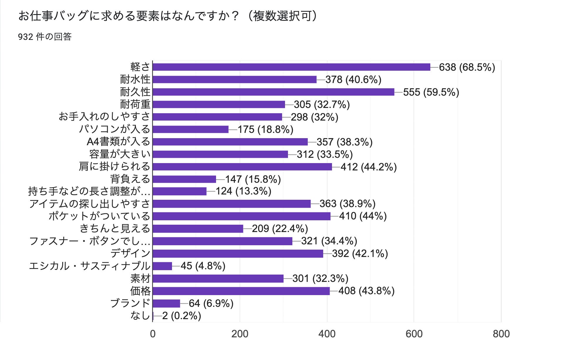 - お仕事バッグに求める要素は「軽さ」と「耐久性」。前回調査と変化なし。