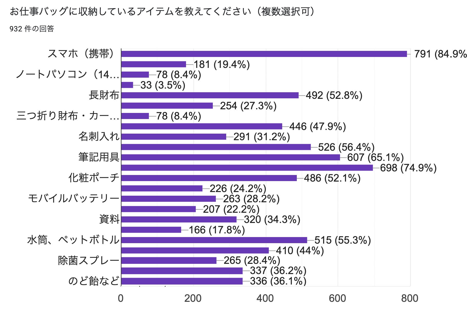 バッグにどんなものを収納するか聞いたところ、スマホや財布などの小物を除くと、「水筒・ペットボトル」(55.3%)、「資料」(34.3%)、「ノートパソコン(13インチ以下)」(19.4%)、「ノートパソコン(14インチ以上)」(8.4%)、「ノートパソコン又はタブレット2台以上」(3.5%)となり、ノートパソコンを持ち歩く女性は3割以上にも上ることがわかりました。