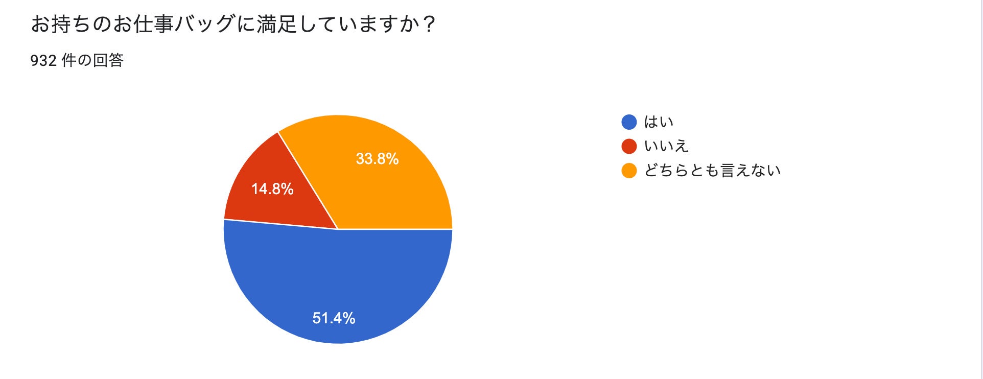 現在お使いのバッグについて、満足しているかどうか調査したところ、「はい」(51.4%)、「いいえ」(14.8%)、「どちらともいえない」(33.8%)となりました。