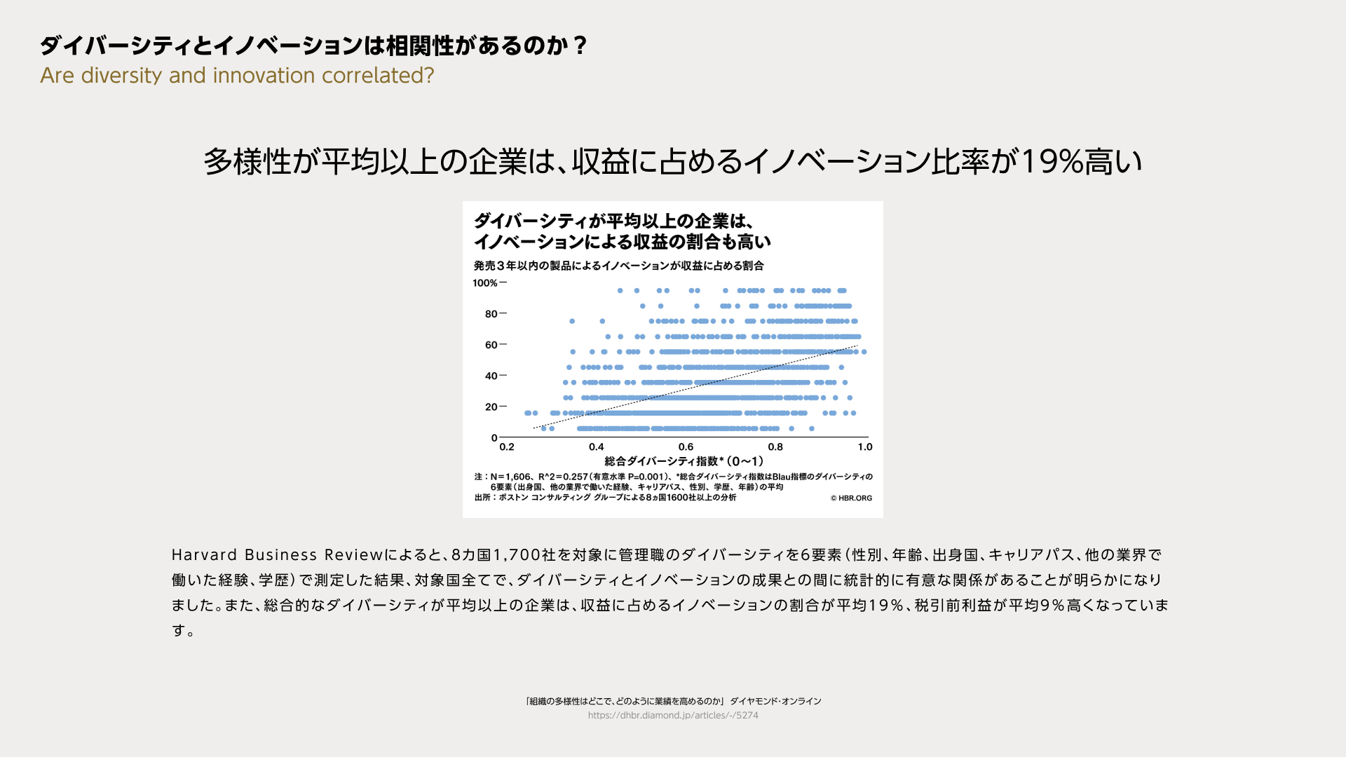 Harvard Business Reviewによると、8カ国1,700社を対象に管理職のダイバーシティを6要素(性別、年齢、出身国、キャリアパス、他の業界で働いた経験、学歴)で測定した結果、対象国全てで、ダイバーシティとイノベーションの成果との間に統計的に有意な関係があることが明らかになりました。また、総合的なダイバーシティが平均以上の企業は、収益に占めるイノベーションの割合が平均19%、税引前利益が平均9%高くなっています。
