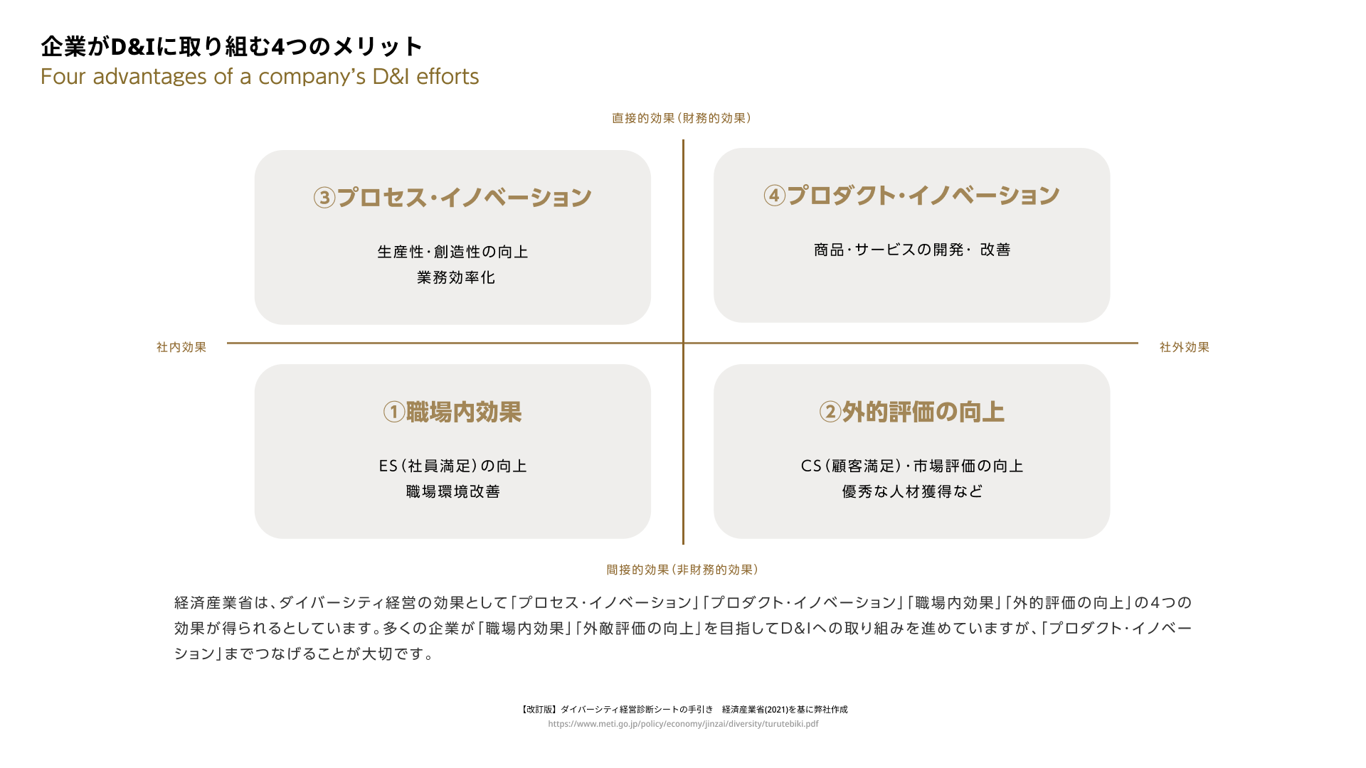 経済産業省は、ダイバーシティ経営の効果として「プロセス・イノベーション」「プロダクト・イノベーション」「職場内効果」「外的評価の向上」の4つの効果が得られるとしています。多くの企業が「職場内効果」「外敵評価の向上」を目指してD&Iへの取り組みを進めていますが、「プロダクト・イノベーション」までつなげることが大切です。