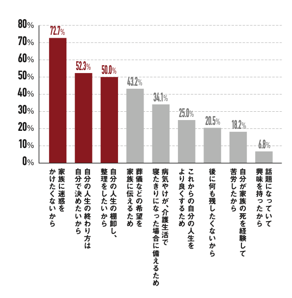 「家族に迷惑をかけたくないから」が7割以上で1位となりました。終活の主な目的は「家族や周囲の人の負担を減らすこと」や「自分の意思を尊重してもらうこと」「自分自身で納得のいく人生を送ることなど」と考えている人が多いいことがその他の結果からも伺えます。この結果から予想されるインサイトとしては「迷惑はかけたくない反面人生の終わりについては向き合いたくない」といった点などがあるかもしれません。自分自身や家族、周囲の人々のために、前向きに取り組むべきものであると社会全体で理解を深めていく必要があります。