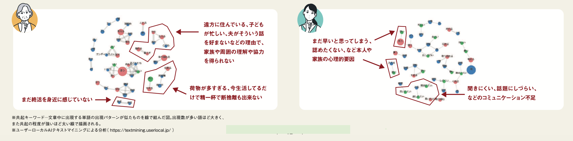 「まだ早いと思ってしまう、 認めたくないなど本人や家族の心理的要因」や「聞きにくい、話題にしづらいなどのコミュニケーション不足」といった課題が上がりました。