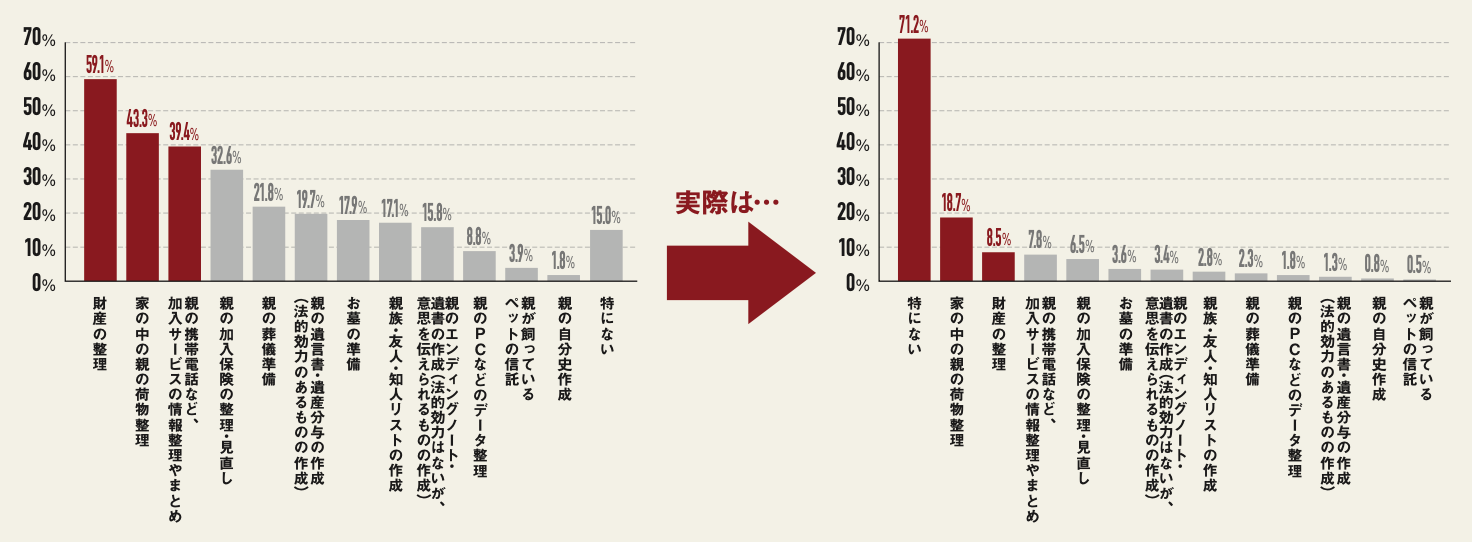 65歳以上の親を持つ子どもへも調査したところ、親と一緒に取り組んでおかないと困るものに「財産の管理」「家の中の親の荷物整理」などの回答が上がりました。対して一緒に取り組んでいるものには「特にない」の回答が7割以上の結果となりました。人生の終わりに向けた準備の必要性や重要性に対する認識が不足していたり、人生の終わりに向けた準備をどのように進めればいいのかわからない、準備に必要な時間が十分に確保できないといった課題がありそうです。親子で人生の終わりについて話し合うための機会を提供したり、親子で人生の終わりに向けた準備を進めるためのワークショップやプログラムを提供するなどが解決策につながるかもしれません。