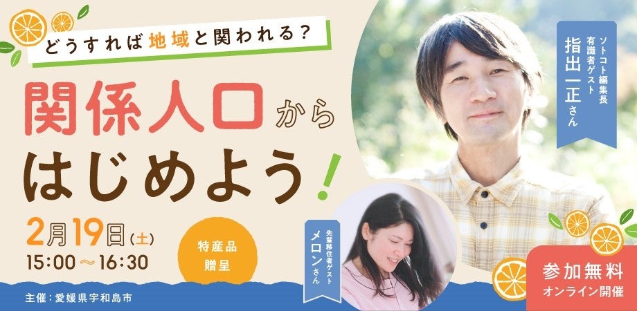 本セミナーでは関係人口有識者としてソトコト編集長の指出一正さんをお招きし、コロナをきっかけに、都市部への人口集中から、地方分散に向かっている動向や、関係人口の先進事例や地域とのかかわり方をお話しいただきます。また、横浜市から宇和島市に移住したメロンさんもゲスト参加。移住者視点での宇和島ぐらしの魅力をお話しいただきます。さらに、より宇和島市について知っていただくべく市長も参加する予定です。
