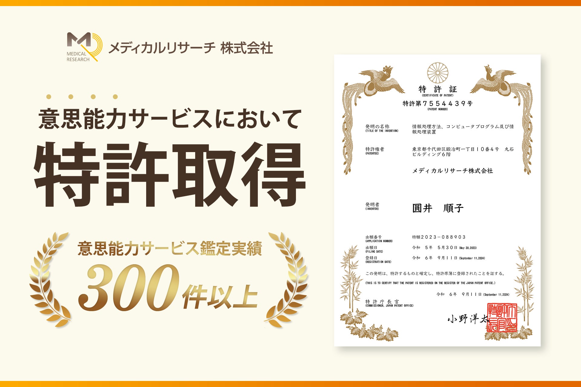 メディカルリサーチ株式会社(東京都千代田区、代表取締役・圓井 順子)は、医療鑑定事業の一環として展開している高齢者の意思能力サービスにおいて、特許を取得したことをお知らせいたします。