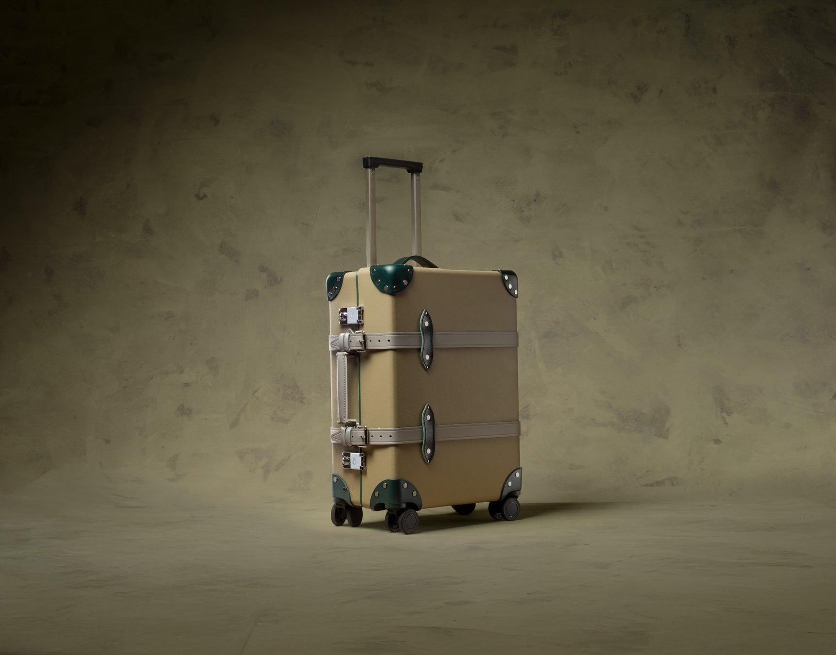 グローブ・トロッター×エレファント・ファミリーの新コレクションは、アジアゾウの生息地である森林の色合いを反映し、アースカラーのオリーブ色のヴァルカン・ファイバーのボディに、ダークなケリーグリーンのレザートリムをあしらっています。 ケースの蓋を開けると、アーティストのレベッカ・キャンベル氏による、移動するアジアゾウの家族を描いた「The Parade」がスーツケースの中に表れ、目的地に着くまでゾウの群れと一緒にいることで安全な旅路を約束してくれます。
