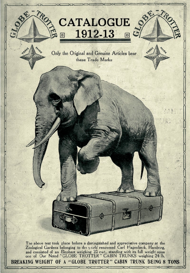 現在、グローブ・トロッターのマスコットとして親しまれているエレファント・ジョンは偶然にもアジアゾウです。 ハンブルグの動物園で行われた1912-13年のカタログに掲載されたこの強度テストは、ハンブルグの動物園で行われ、エレファント・ジョンが誇らしげにグローブ・トロッターのスチーマートランクの上に立っている象徴的なイメージは現在も使用されています。