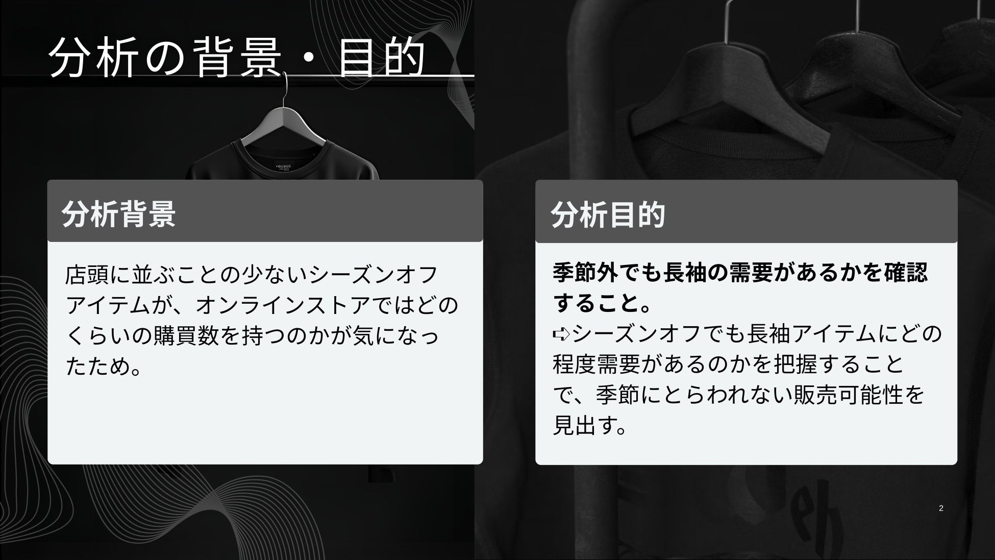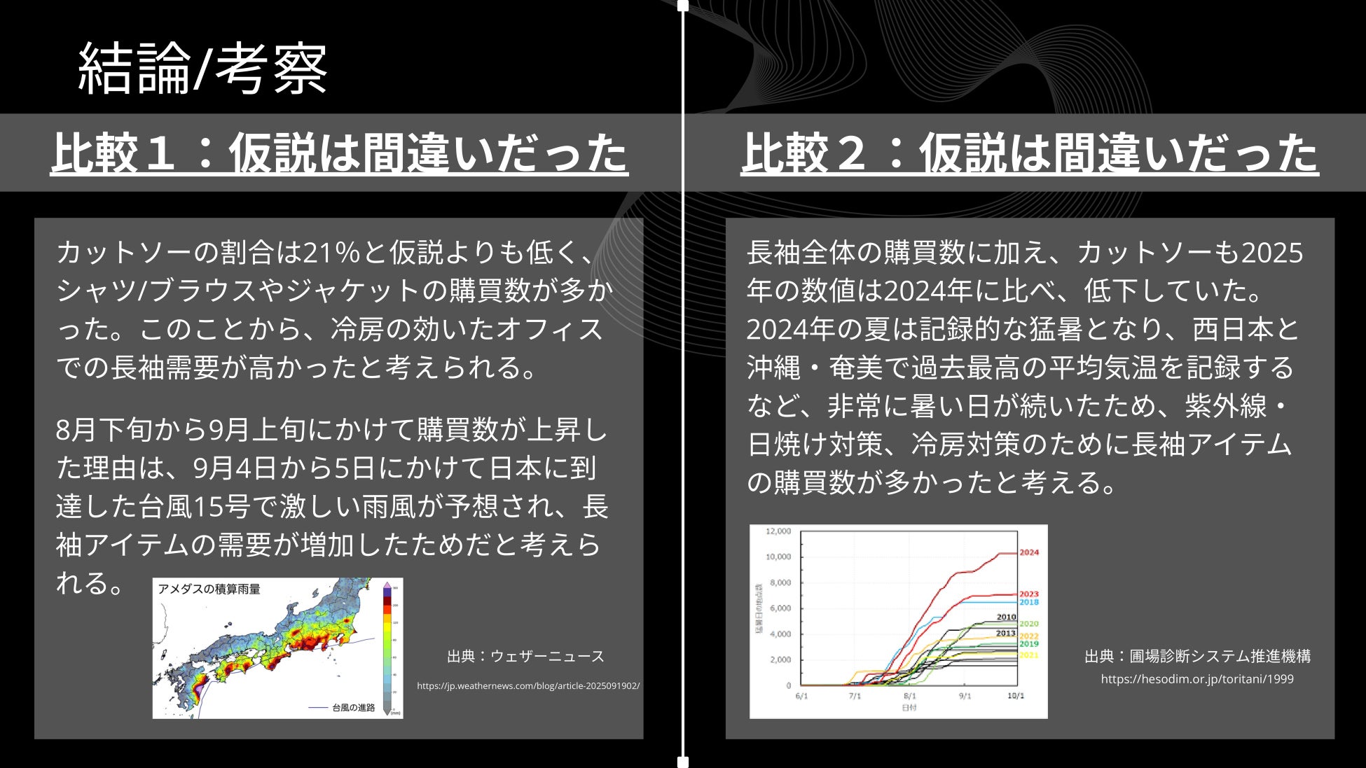 「温暖化の影響で夏は暑さを増し、人々の室内で過ごす時間が増えたからこそ、冷房対策のための長袖が必要とされているのではないか?」という仮説はとても筋道が立っているもので、かつ気候変動を受けて商品構成に苦戦しているアパレル業界にとってとても意義のあるテーマだと思います。