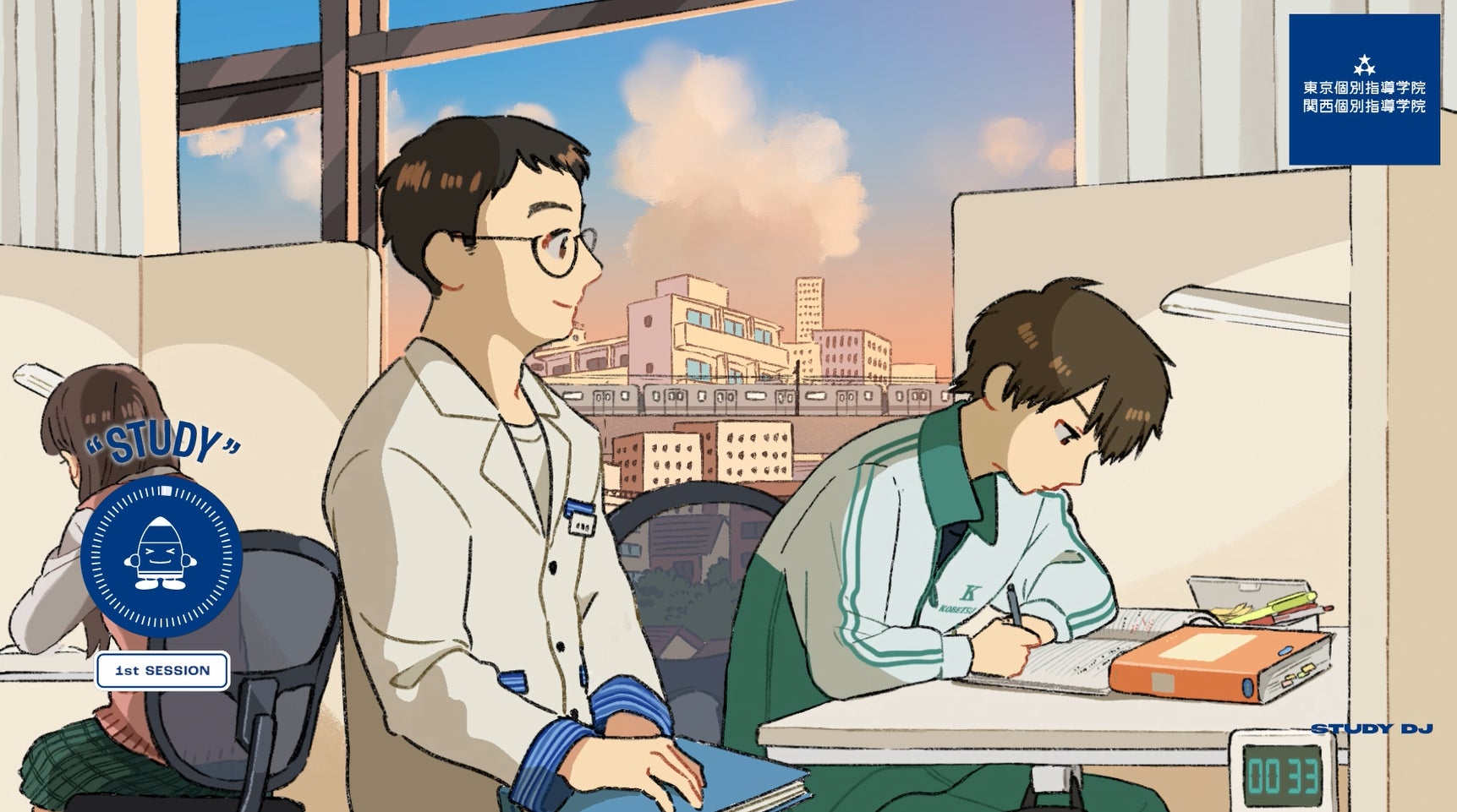 昨今、中高生の多くは音楽とアニメを掛け合わせた「BGM動画コンテンツ」を勉強のパートナーとして利用しています。『STUDY DJ』 では、脳科学に基づいて勉強パフォーマンスを向上させる音楽を追求し、適切なリズムの曲を適切な順序で選曲したBGM集を作成しました。さらに、教室の心地よさや実際の授業の雰囲気をたくさんの方に感じていただくために、ソーシャルメディアで若者世代に支持されているイラストレーターに作画を依頼しました。東京個別指導学院・関西個別指導学院の講師は約9割が現役大学生・大学院生。担当講師が生徒の目標達成まで伴走します。生徒と講師は対話しながら授業を行いますが、その普段の授業シーンをアナログな雰囲気のイラストで表現しています。まるで塾でいっしょに勉強しているような気分になれる、勉強集中のパートナーになる動画です。