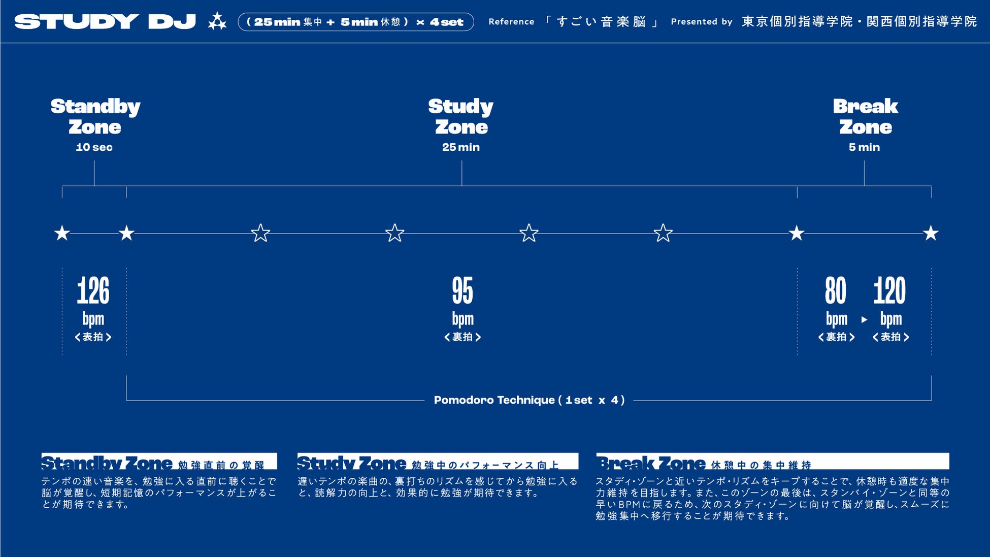 遅いテンポかつ裏打ちの曲を教科書や資料を読む前に聞くと、読解力が向上するとされています。スタディ・ゾーンでは、楽曲の裏打ちのリズムを感じながら勉強することで、より効果的に勉強できることが期待できます。