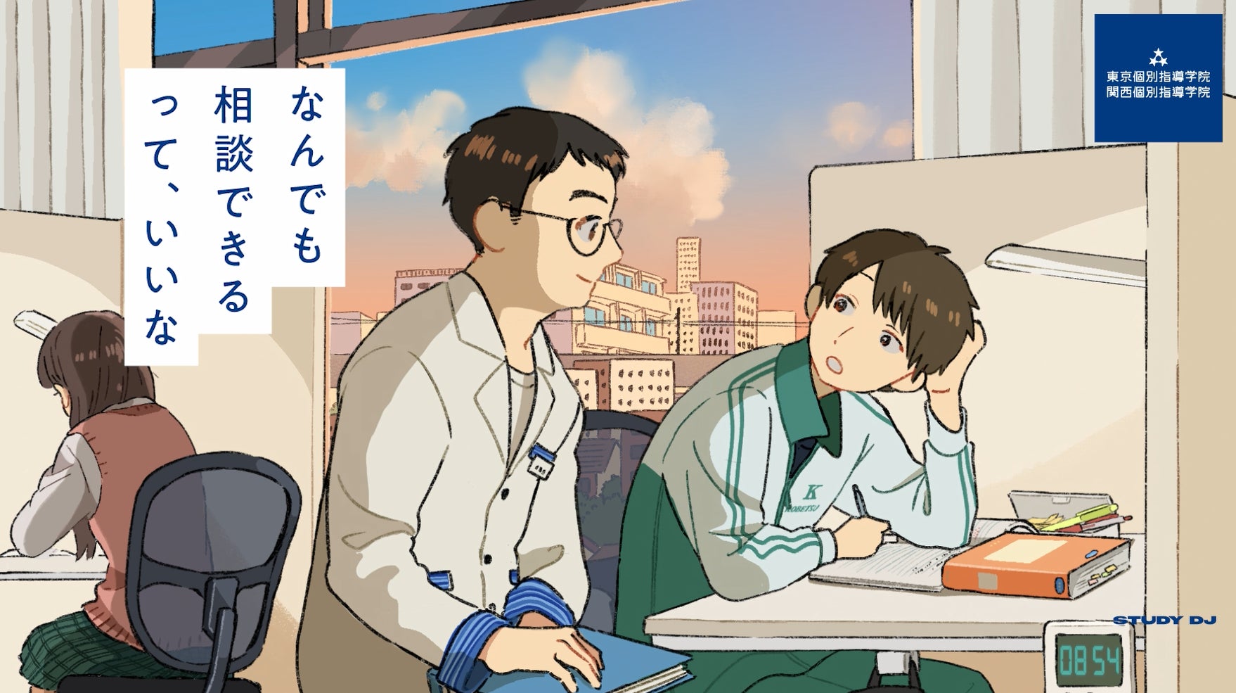 『STUDY DJ』 と同日、東京個別指導学院・関西個別指導学院の授業風景のイラストをもとにした15秒のWeb CMを4作品公開しました。「勉強のプレッシャーや不安の中でがんばる生徒」と「生徒の気持ちに寄り添い、ともに乗り越えたいと考える講師」との関係性を 『いっしょなら、乗り越えられそう。』 という共通メッセージで表現しています。