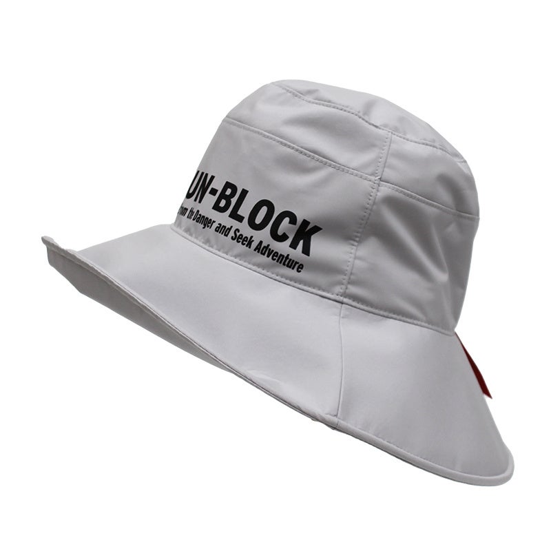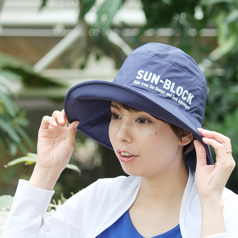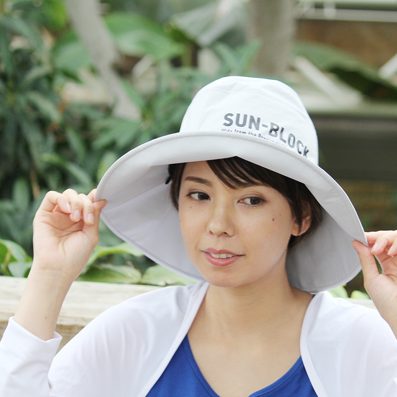 この製品は、完全遮光素材を使ったバケットタイプの帽子で、360度どこから日が差してきても、お顔をしっかり守れるデザインです。