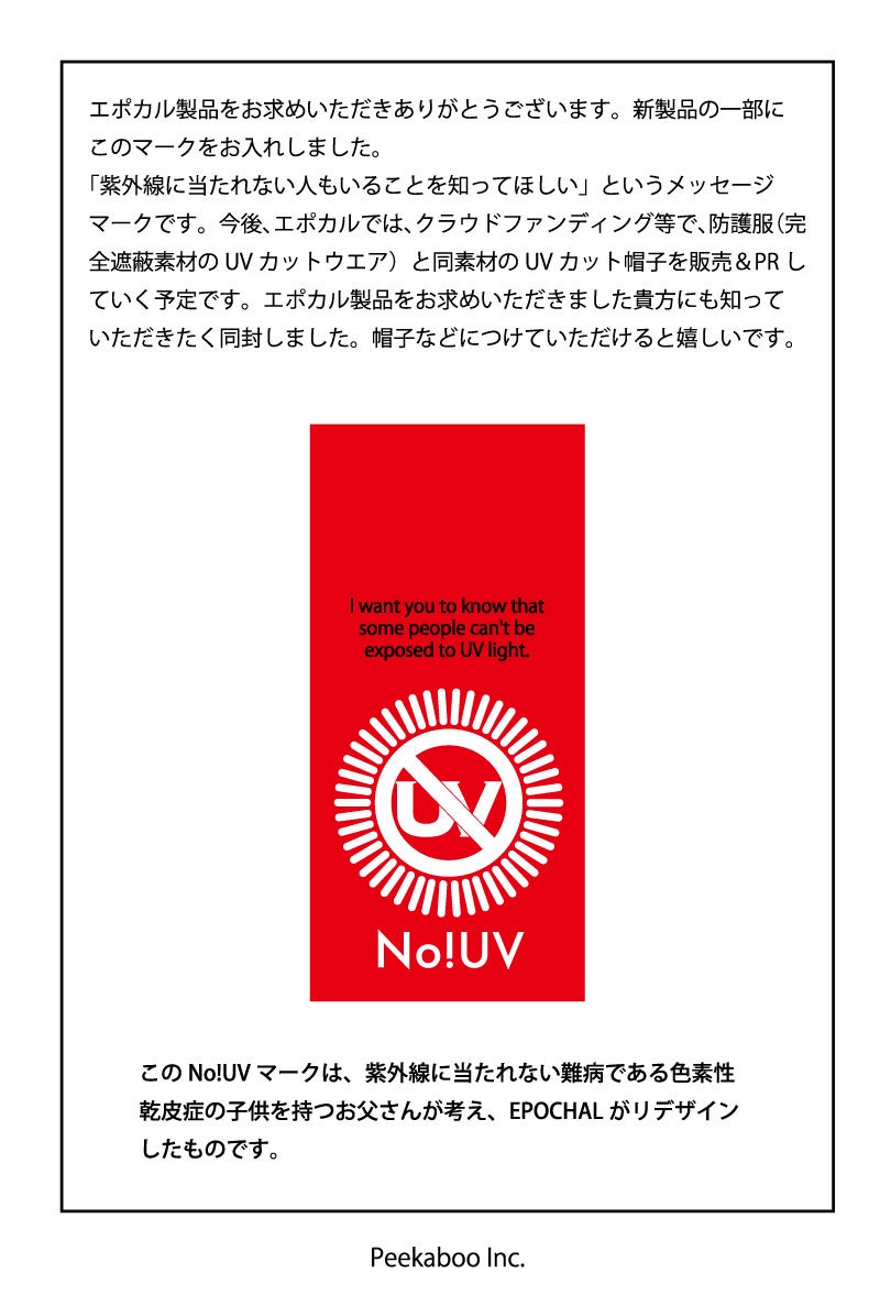 マークの認知が進み、なぜそのような格好をしなければならないか理解してもらえれば、心無い言葉を受けることも減るはずです。わが子を守るため始まったプロジェクトをエポカルも応援したいと考え、発案者のお父さんの承諾を得てリデザインしたエポカルオリジナルの“NO! UVマーク”タグをつけました。