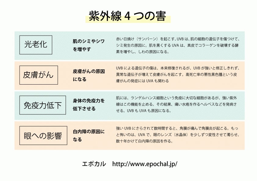 日焼けは肌に蓄積され、間違った細胞分裂を繰り返すことにより皮膚癌にもなります。