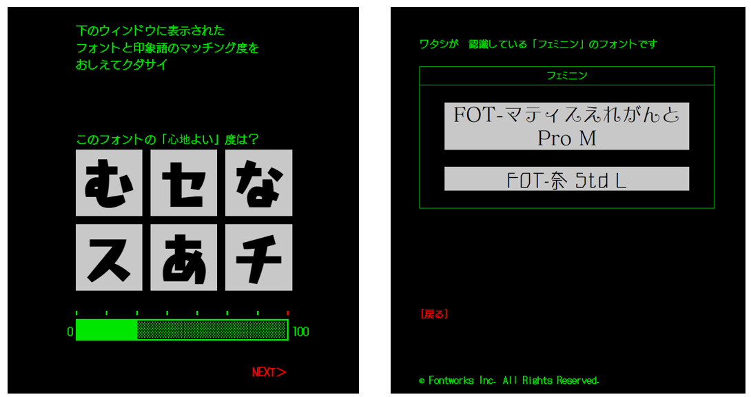 多くの方々に遊んでいただくことで、フォントワークスの提供するサービス『印象語検索AI(β版)』『人工知能6号』がより精度の高い検索機能を提供できるようになり、皆さまのクリエイティブ活動のお役に立てば幸いです。
