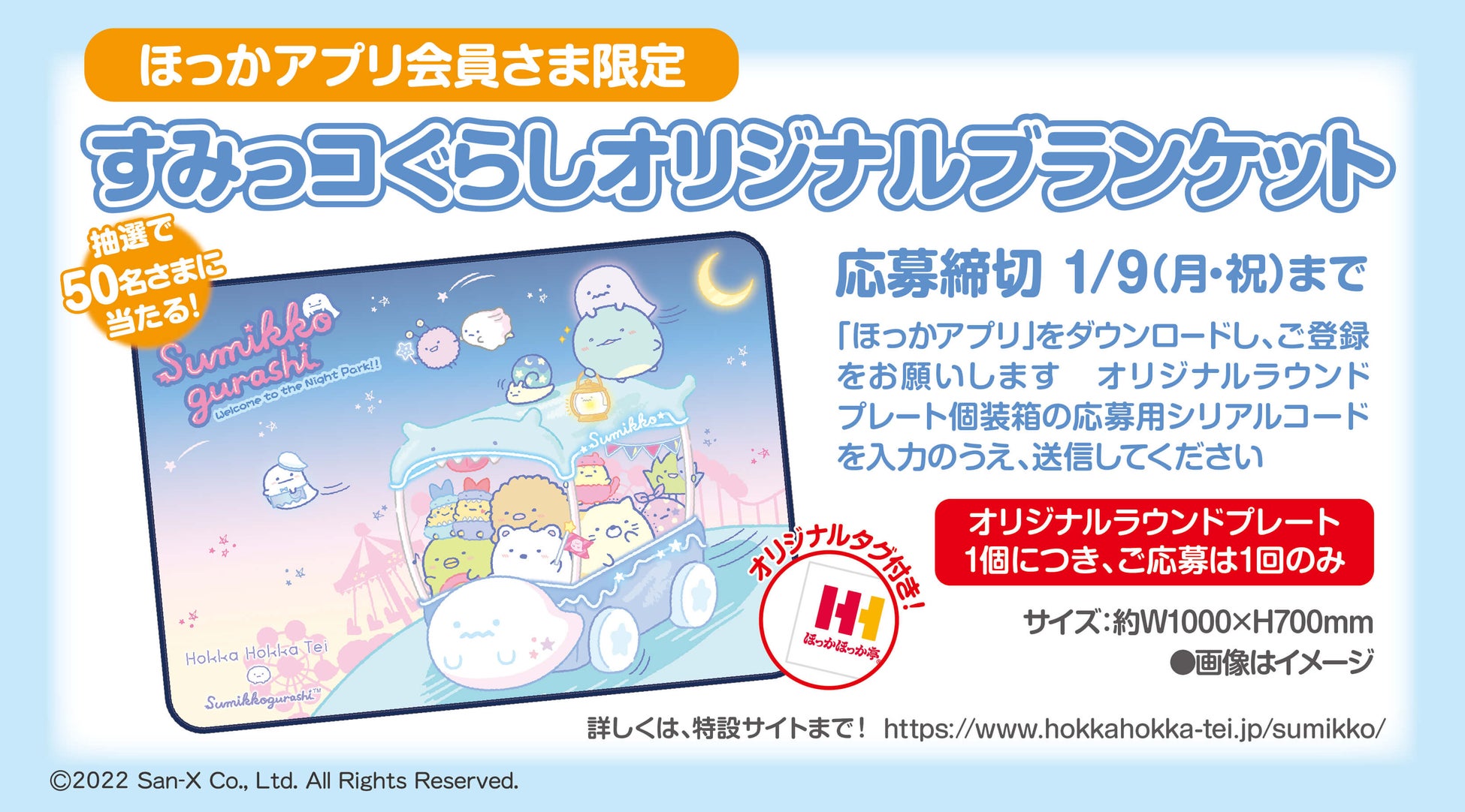 更に、恒例のほっかほっか亭公式アプリ「ほっかアプリ会員さま限定企画」を実施致します。オリジナルラウンドプレートの個装箱の裏側に貼付されている応募シリアルコードを、ほっかアプリの特設ページに入力のうえご応募ください。抽選で50名さまに、「すみっコぐらしオリジナルブランケット」をプレゼント。どしどしご応募ください。