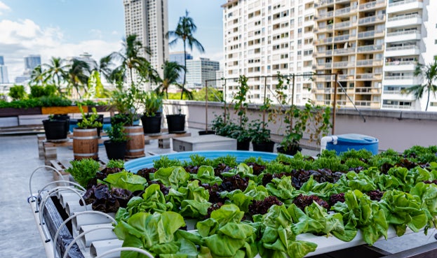 ・屋上庭園で、アクアポニックスと呼ばれる水耕栽培と魚の飼育装置を兼ねそろえた新しい農業技術を活用し、養殖と農作物を環境に優しく育てています。ここで育てた食材は、レストランで提供されます。