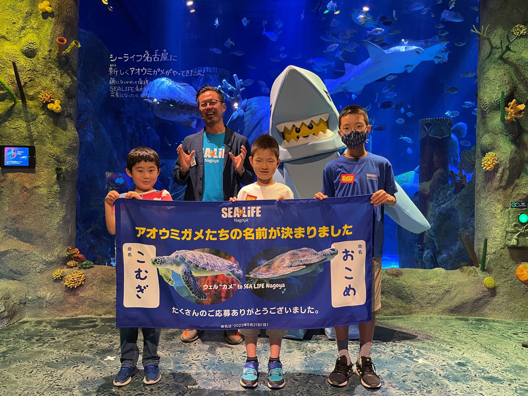 「こむぎ」の名付け親となった栗林さんは「これから(アオウミガメたちが)元気に過ごしてほしいです」、「おこめ」の名付け親となった家田さんは「餌をたくさん食べて、大きくなってほしいです」と語り、2頭のアオウミガメがシーライフ名古屋を訪れるゲストたちから愛され、子どもたちを笑顔にする存在になっていくことを祈念しました。