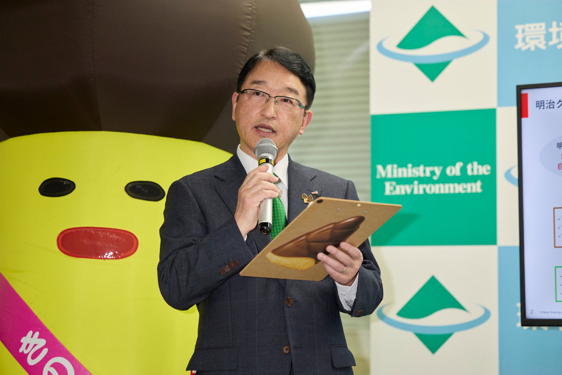 明治ホールディングス株式会社 松岡CSO、株式会社 明治 萩原執行役員が登壇し、環境省への報告・宣言を行いました。