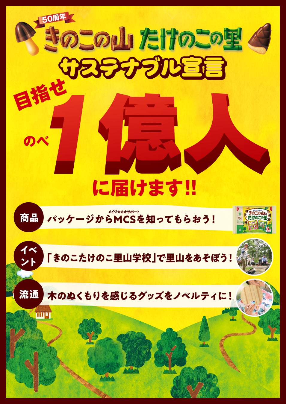 『きのこの山たけのこの里サステナブル宣言』では、商品・イベント・流通の3つを通して、里山の大切さやカカオのサステナブルな生産・調達に向けた取り組みを、のべ1億人の方に伝えていくことを宣言いたします。