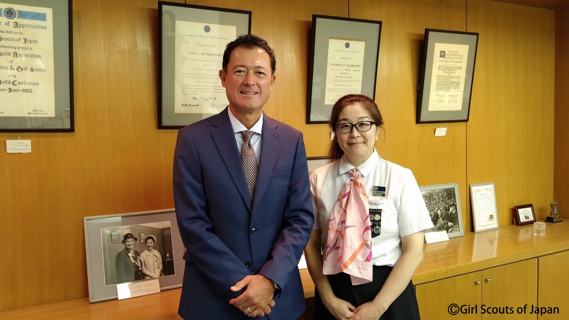 写真はパロアルトネットワークス株式会社 代表取締役会長兼社長 アリイ・ヒロシ氏と、ガールスカウト日本連盟 会長 間奈々恵