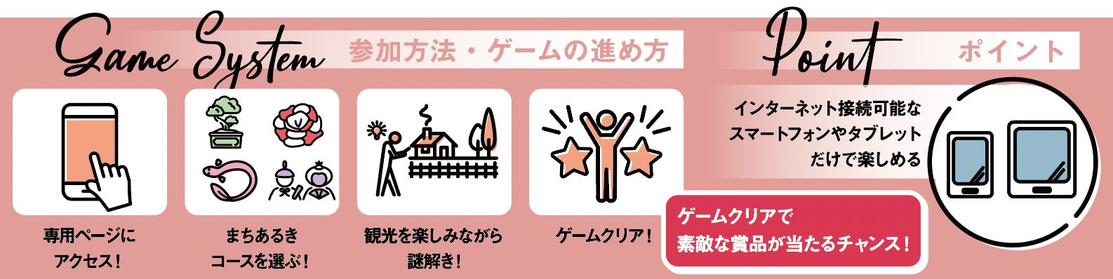 ●さいたま謎旅-まちあるき-は、お手持ちのスマートフォン・タブレットから、まちあるき専用ページにアクセスし、プレイヤー登録後、さいたま市内を巡り観光をしながら楽しむ謎解きゲームイベントです。