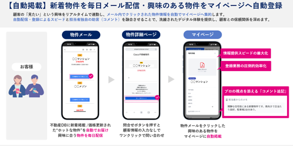 不動産データベースに新着掲載・価格更新された物件の中から、お客様一人ひとりの細かな住まい探し条件に合致した物件の概要情報だけを毎日自動でメール配信します。大量の物件情報を一斉に送るのではなく、「この人にはこの物件」という個別の提案が自動で実現するため、お客様にとっても担当者からの情報として自然に受け取れます。また、担当者がプロの目線で厳選した自社おすすめ物件を手動でマイページに追加することも可能です。クリックされた物件・追加された物件は自動でマイページに集約され、担当者は「駅近で人気です」「日当たり良好」といったコメントを添えながら、お客様一人ひとりに寄り添った提案を実現できます。