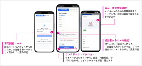 住宅購入を検討するお客様にとっては、複数の物件情報がメールに散在して「あの資料どこだっけ?」と混乱するストレスから解放され、「迷わない、忘れない、煩わしくない」住まい探し体験が実現します。不動産会社にとっては、お客様の行動をリアルタイムで把握しながら最適なタイミングでアプローチできる「攻めの追客」と「圧倒的な業務効率化」が同時に手に入ります。