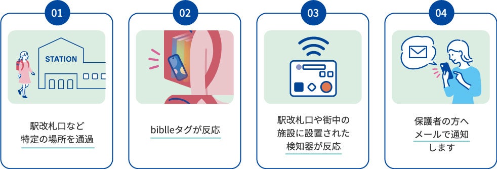 小田急線の駅や特定の場所に設置された専用検知器でお子さまが携帯している「biblleタグ」を感知し、通過した際に保護者の方にメールで通知します。