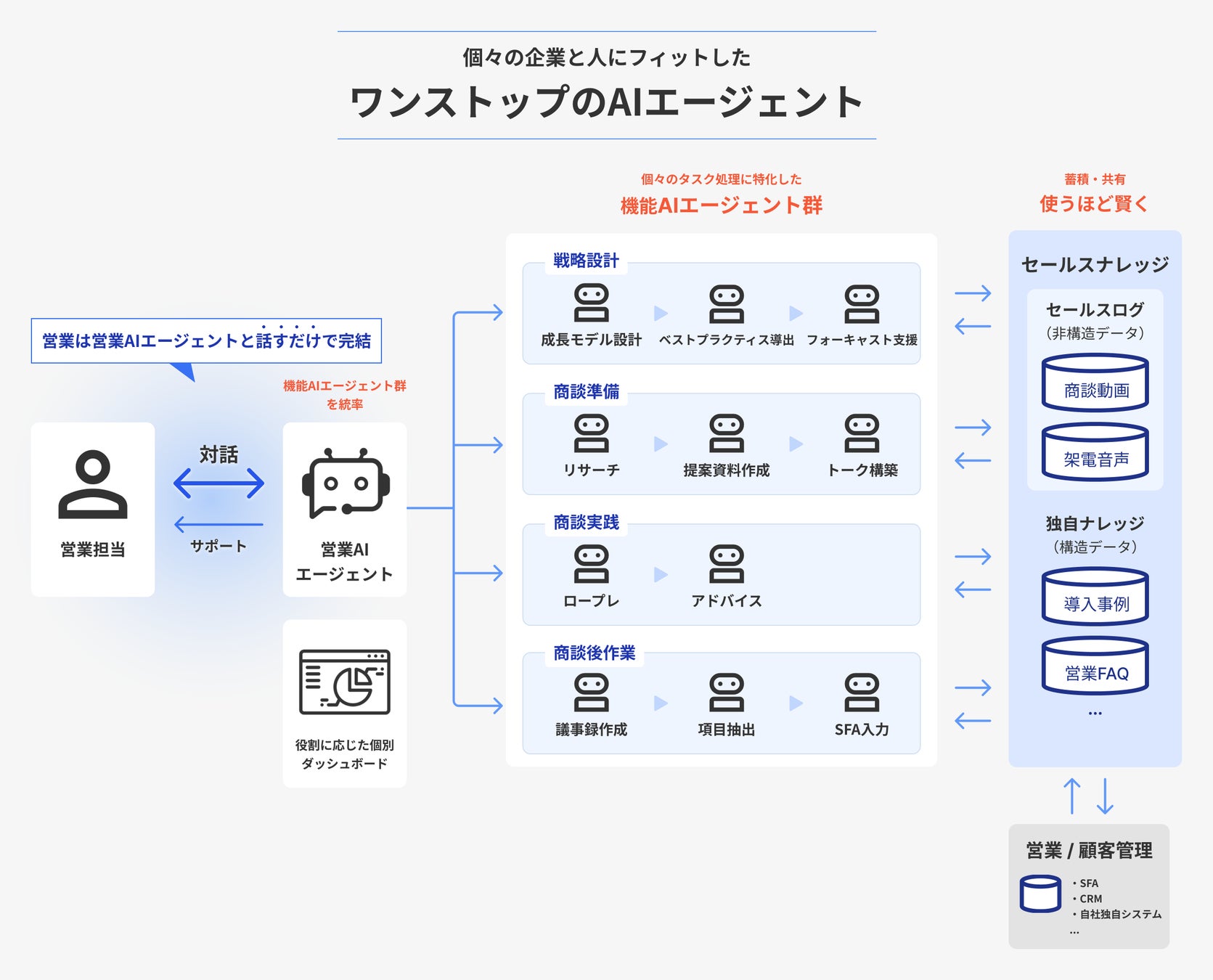 営業担当者は普段の業務で必要な情報収集を、検索したり人に相談する代わりにAIとの対話で完結できるようになります。AIは、対話を通して提案内容や使用した資料を記録し、商談の録画データや架電音声といった非構造データも整理・構造化してSFA・CRMの実績データと紐づけながら蓄積します。