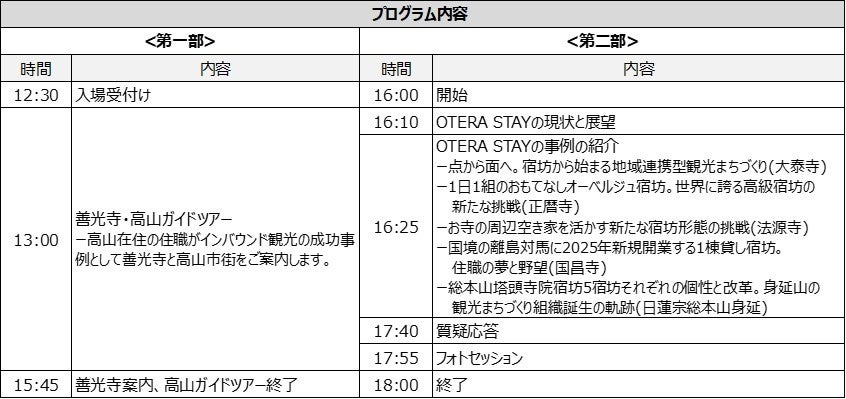 人口減少や少子高齢化、お墓に対する価値観の変容など、社会全体の変化に伴い、現在のお寺は経営難や後継者問題など多くの課題を抱えています。OTERA STAYサミットは、このような課題はお寺特有のものではなく、社会全体の課題でもあると考え「お寺の可能性と日本の地域が抱える社会課題解決」をテーマに、全国で活躍するソーシャル・アントレプレナーシップをもった住職たちが集まり、最前線の宿坊や各寺院の取り組みについてプレゼンテーションを行います。第1回目の OTERA STAYサミットは、廃業寸前であったところから見事に再生し、年間 6000 名近い外国人が集まる人気の宿坊となった「Temple Hotel 高山善光寺」にて開催。インバウンド観光の成功事例として名高い高山市街や寺町である東山遊歩道の視察などを通して、フィールドワークも実施予定です。