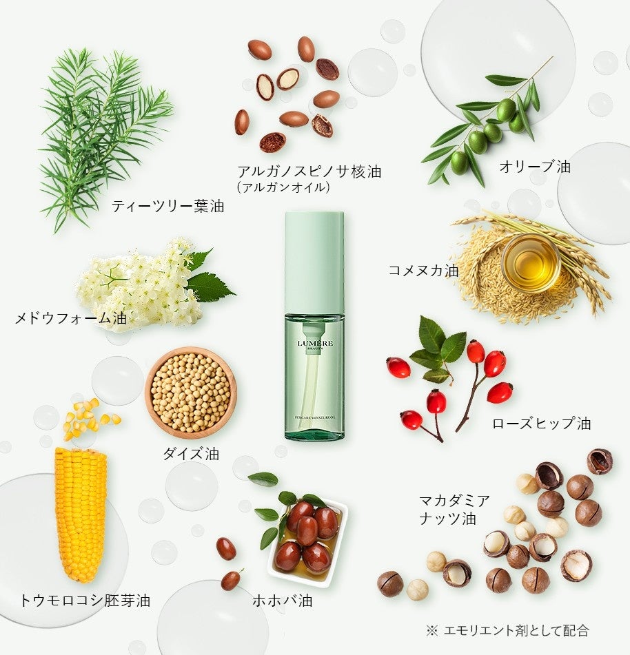 2種の乳酸菌由来成分(乳酸桿菌/セイヨウナシ発酵液*、ー乳酸桿菌/ハス種子発酵液*)と、厳選した10種のボタニカルオイルをブレンド。オイルのベトつきが苦手な方でも安心して使っていただけるよう配合にもこだわり、潤うのにサラッとした仕上がりです。