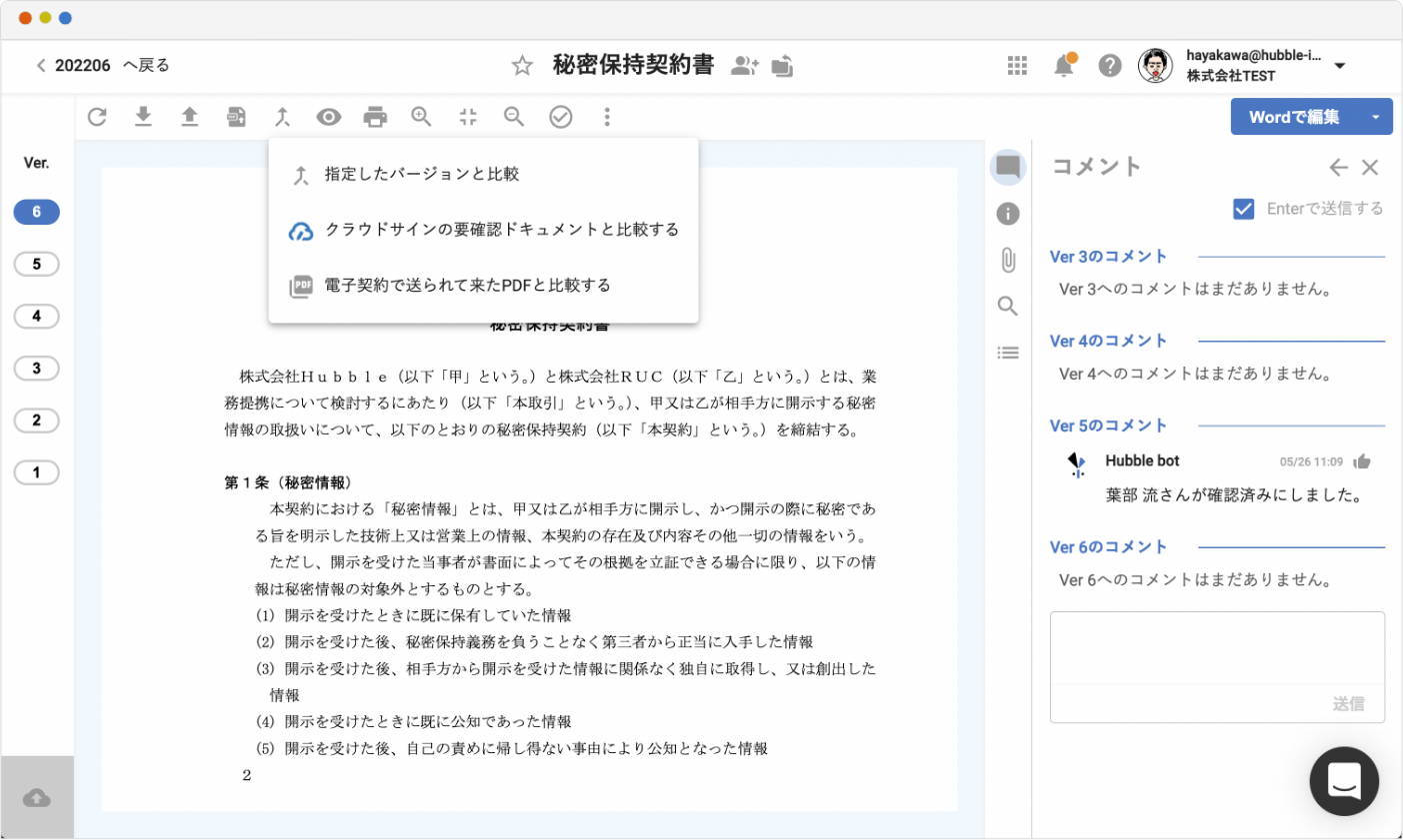 株式会社Hubble(東京都港区、CEO:早川晋平、以下「Hubble社」)が提供する契約業務クラウドサービス「Hubble」は、交渉相手から契約書PDFが送られてきた際に瞬時に差分を表示しチェックできる、「電子契約PDF差分チェック」機能を実装しました。この機能はクラウドサインとの連携が最も便利ですが、その他の電子契約で送られてきたPDFでも照合が可能です。「Hubble」はお客様の業務効率化を第一に考え、抜け漏れなく、早く、正確な契約業務を提供します。