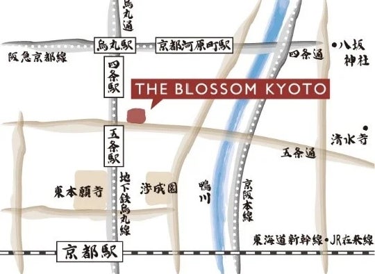 JR九州ホテルズアンドリゾーツ株式会社が展開する宿泊主体型ハイグレードブランド「THE BLOSSOM」の4施設目として京都市下京区に2022年8月26日に開業したホテルです。京都駅より地下鉄で1駅、五条駅徒歩2分の立地にあり、清水・祇園エリアへのアクセスに便利で京都観光の拠点となる最適なロケーションで皆さまをお迎えいたします。