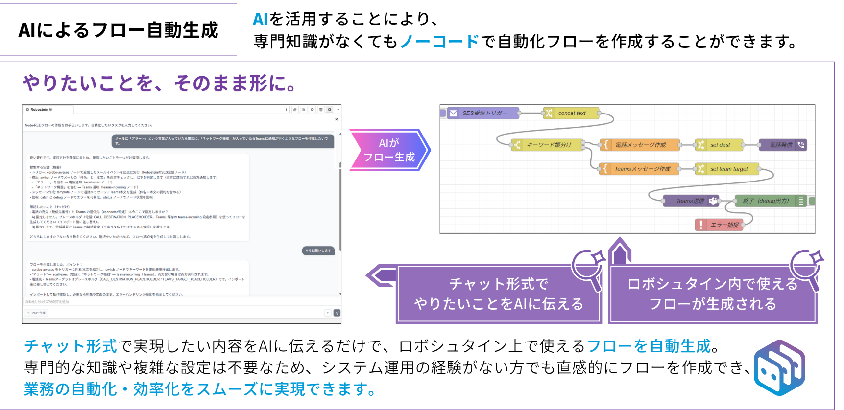 株式会社コムスクエア(本社:東京都中央区、代表取締役会長:上嶌 靖、以下 コムスクエア)は、提供するIT運用自動化プラットフォーム「Robostein(ロボシュタイン)」において、AIが自動化フローを自ら生成する新機能を実装したことをお知らせいたします。