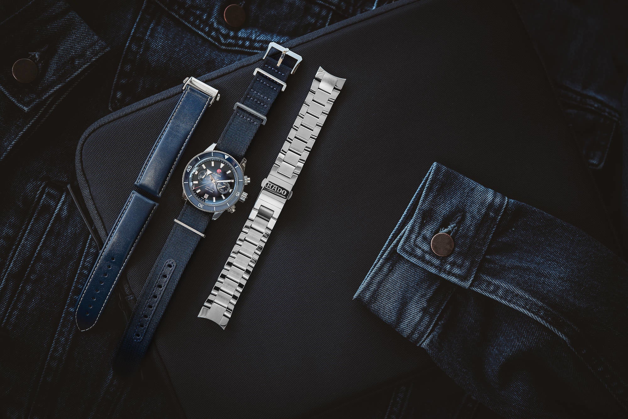 - ダイアル:シルバーからブルーへのグラデーション、ロジウムカラーのアプライドインデックス、ホワイト スーパールミノバ®加工、ロジウムカラー 動く錨のシンボル&レッドのバックプレート付、ホワイト プリントでRadoおよびCaptain Cookロゴと300m/1000ft
