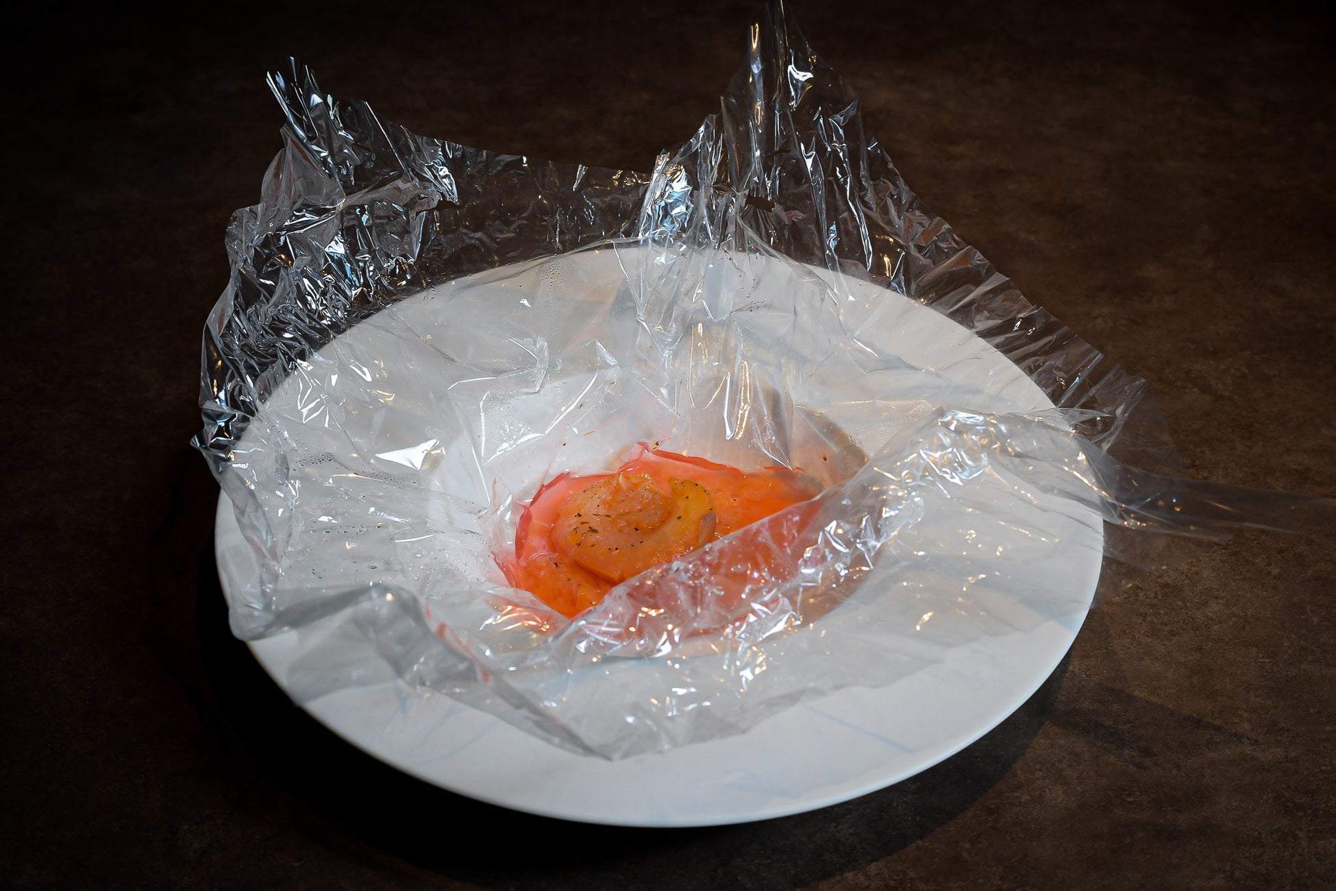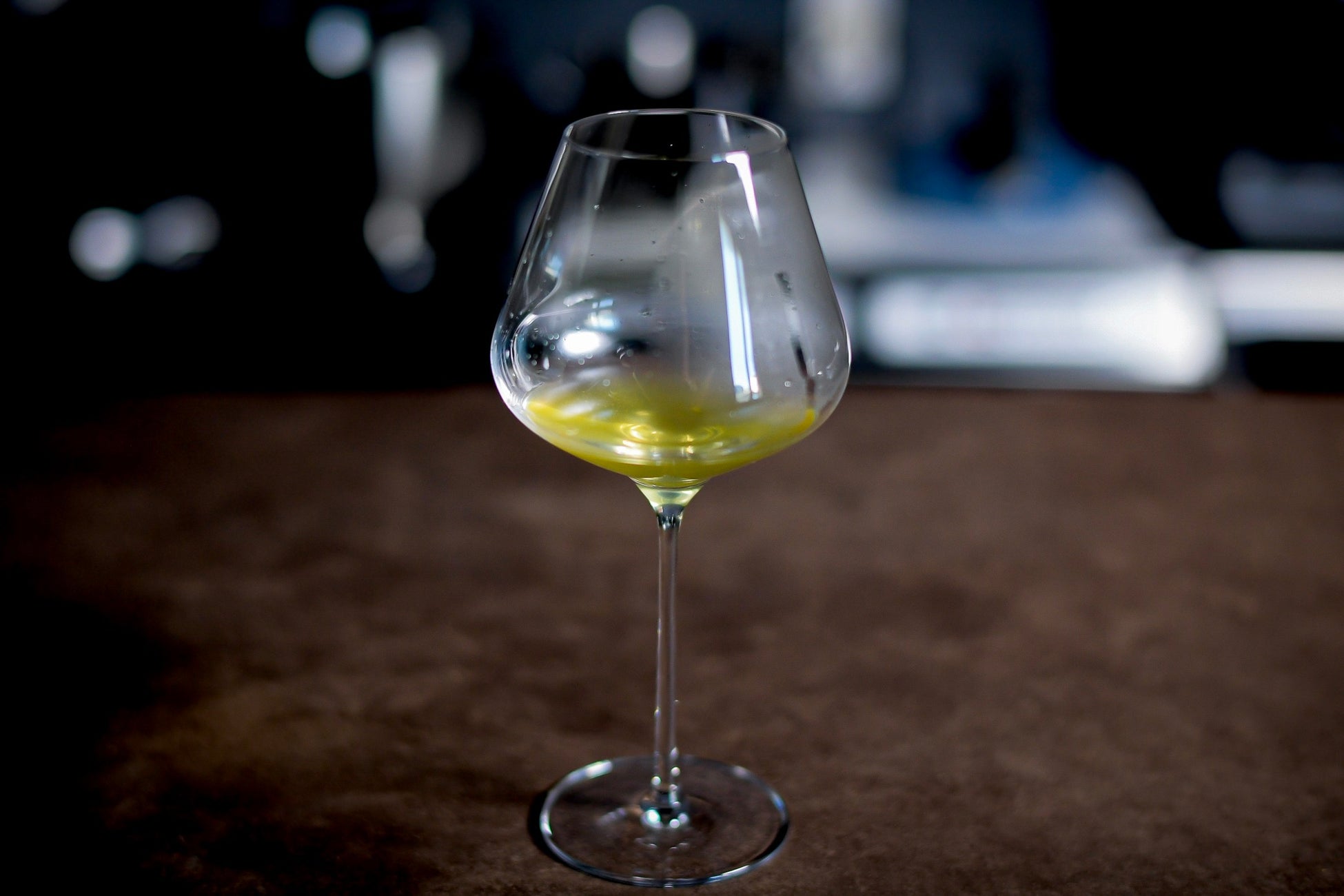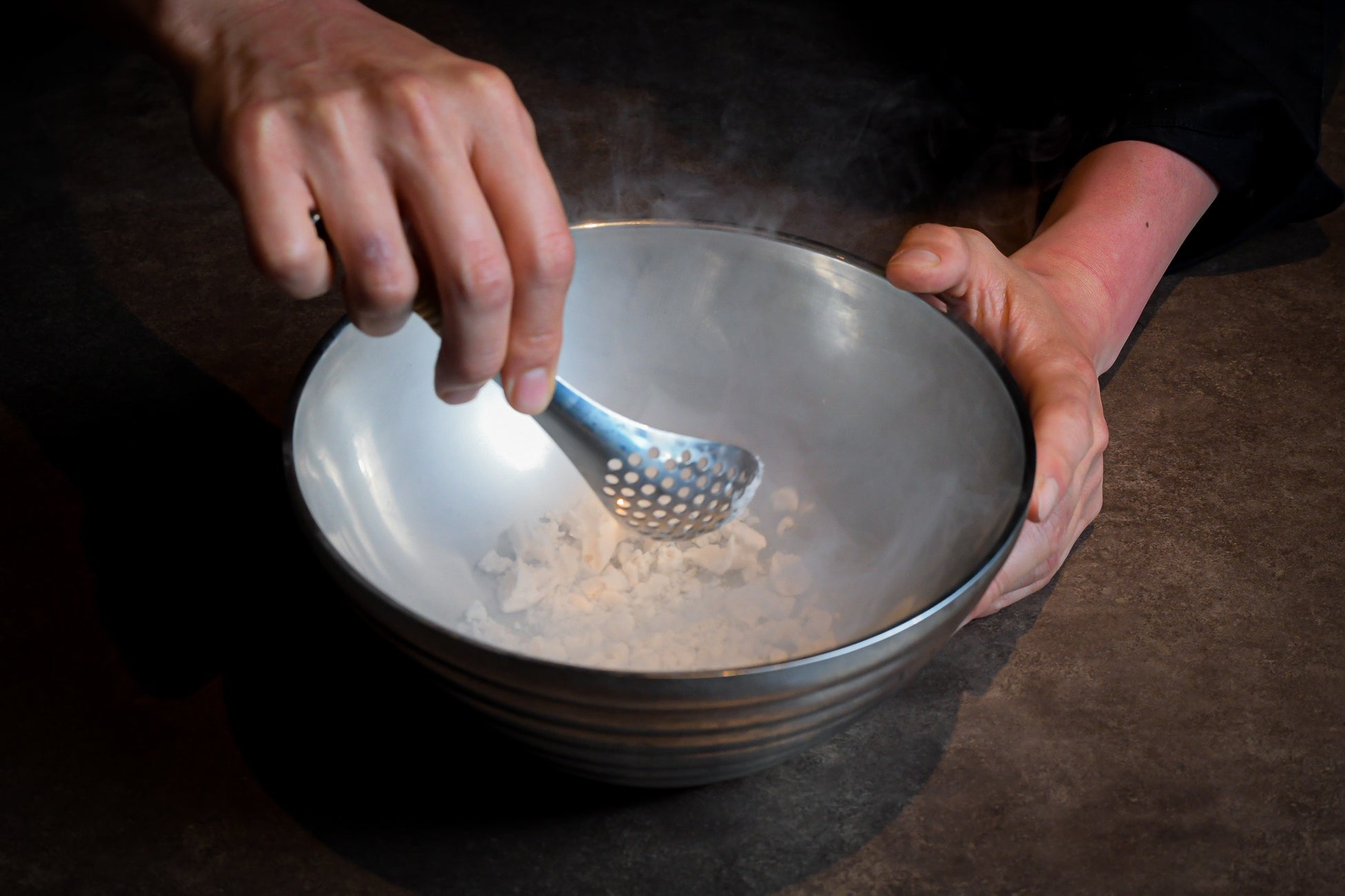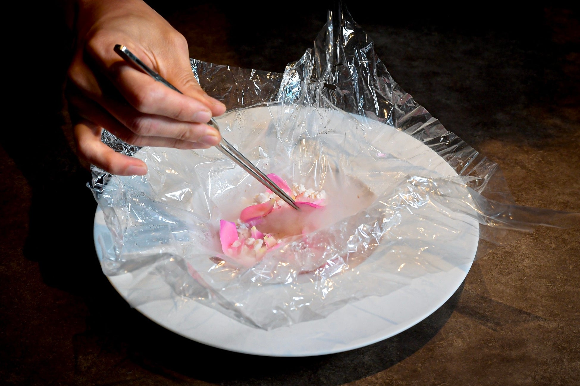バラの香りと味わいをしっかりと感じられるデザート「芳(ほう)」。構成はプラムのシードルコンポート、プラムエキス、バラエキスの液体窒素アイス、バラの花弁。嗅覚からくるバラと、味わうバラの2つのバラ体験をお楽しみいただけます。香りの設計は、オーバナイトセーションのシャープな香りを始めに感じ、徐々に香りのボディが膨らんでいき、最後はプラムの余韻と共に消えていくイメージで作りました。ペアリングには「眠姫」。プラムのような香りがする日本茶を合わせます。新茶の青葉アルコール特有のフローラルな香りと、初夏のフルーツのジューシーさを主軸に構成した6月のデザートコースの中でお楽しみください。